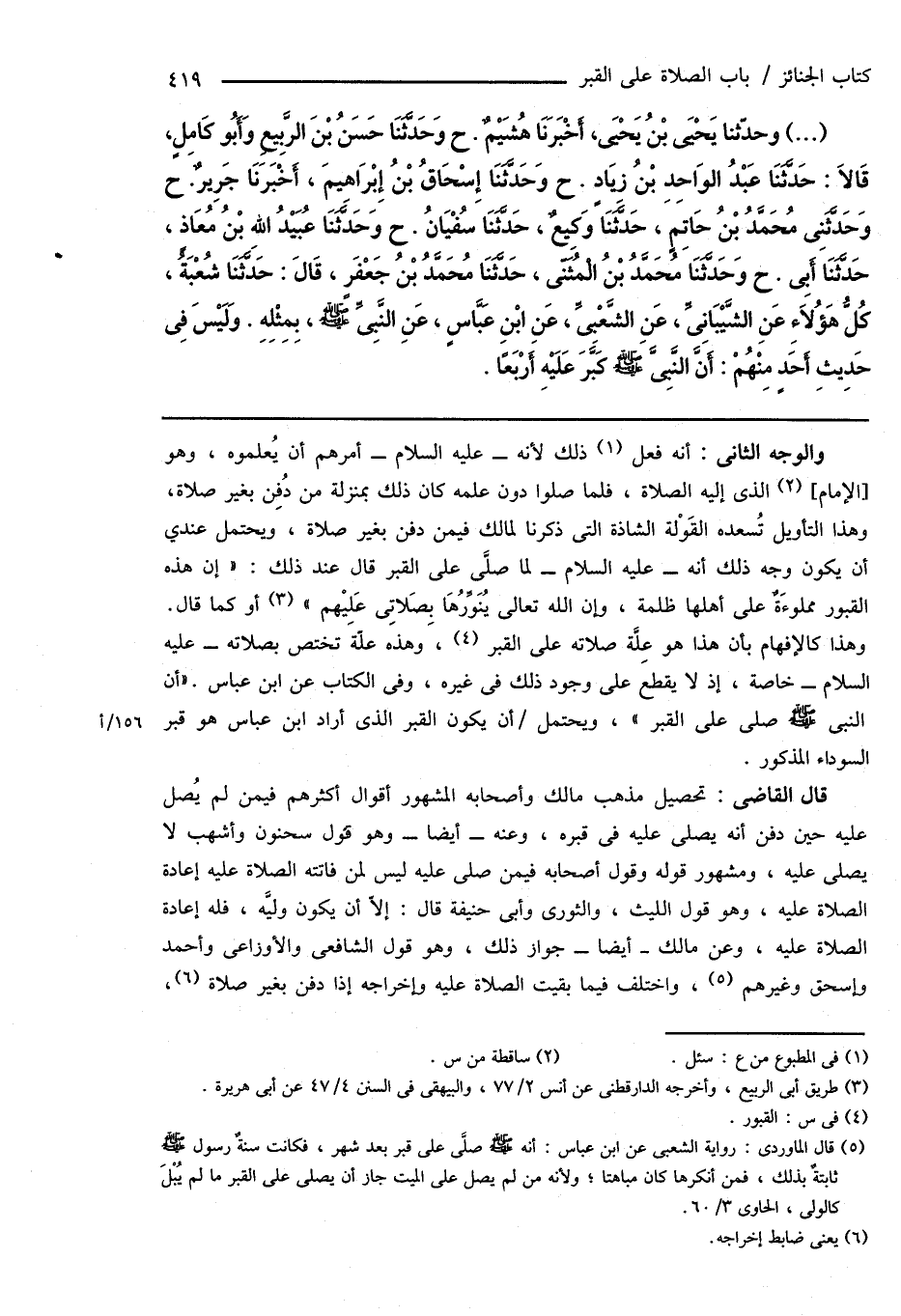(¬5) قال الماوردى: رواية الشعبى عن ابن عباس: أنه صَلَّى اللهُ عَلَيْهِ وَسَلَّمَ صلَّى على قبر بعد شهر، فكانت سنةٌ رسول صَلَّى اللهُ عَلَيْهِ وَسَلَّمَ ثابتةٌ بذلك، فمن أنكرها كان مباهتاً؛ ولأنه من لم يصل على الميت جاز أن يصلى على القبر ما لم يُبْلَ كالولى، الحاوى 3/ 60.