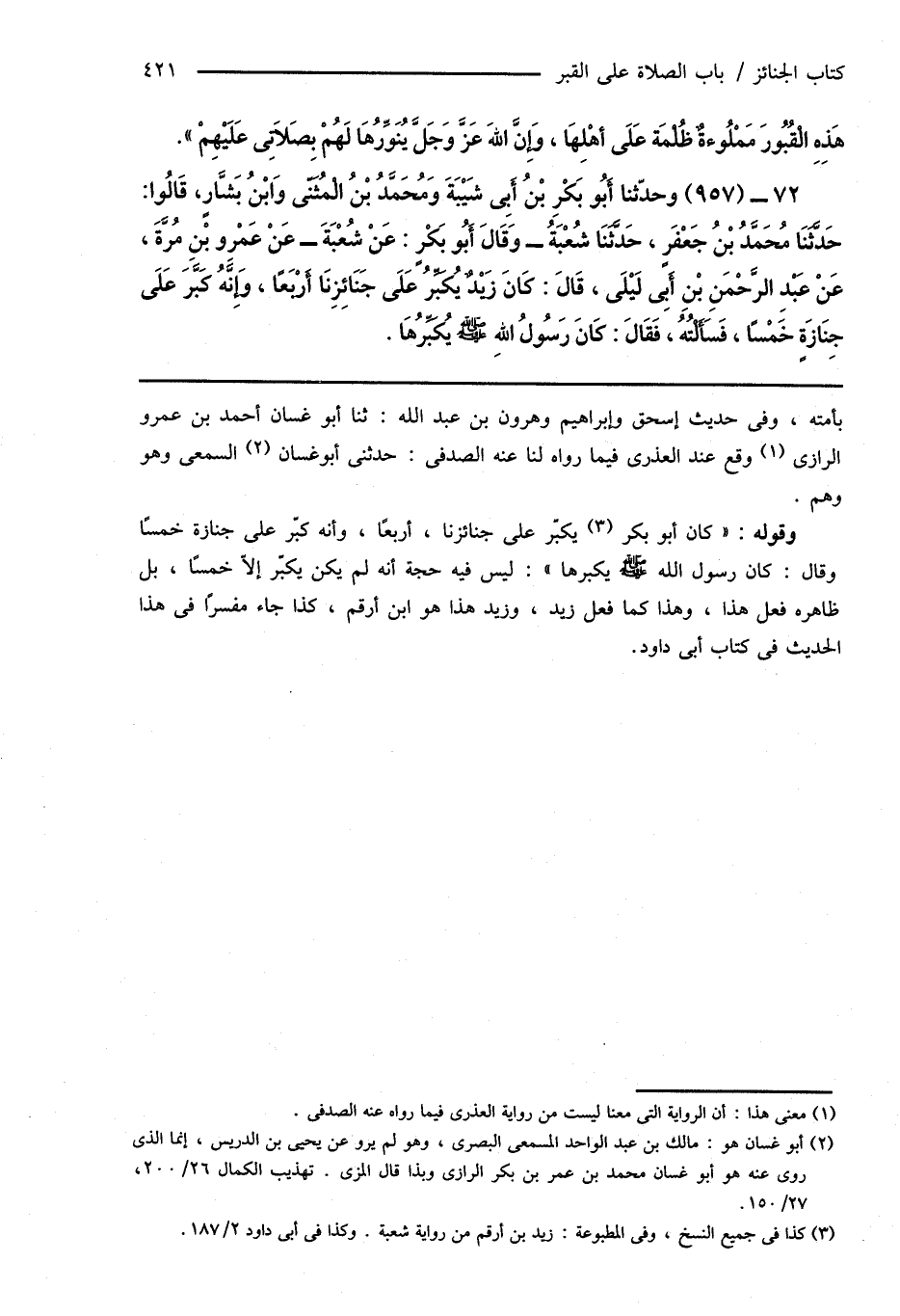 72 - (957) وحدّثنا أَبُو بَكْرِ بْنُ أَبِى شَيْبَةَ وَمُحَمَّدُ بْنُ الْمُثَنَّى وَابْنُ بَشَّارٍ، قَالُوا: حَدَّثَنَا مُحَمَّدُ بْنُ جَعْفَرٍ، حَدَّثَنَا شُعْبَةُ - وَقَالَ أَبُو بَكْرٍ: عَنْ شُعْبَةَ - عَنْ عَمْرِو بْنِ مُرَّةَ، عَنْ عَبْدِ الرَّحْمَنِ بْنِ أَبِى لَيْلَى، قَالَ: كَانَ زَيْدٌ يُكَبِّرُ عَلَى جَنَائِزِنَا أَرْبَعًا، وَإِنَّهُ كَبَّرَ عَلَى جِنَازَةٍ خَمْسًا، فَسَأَلْتُهُ، فَقَالَ: كَانَ رَسُولُ اللهِ صَلَّى اللهُ عَلَيْهِ وَسَلَّمَ يُكَبِّرُهَا.