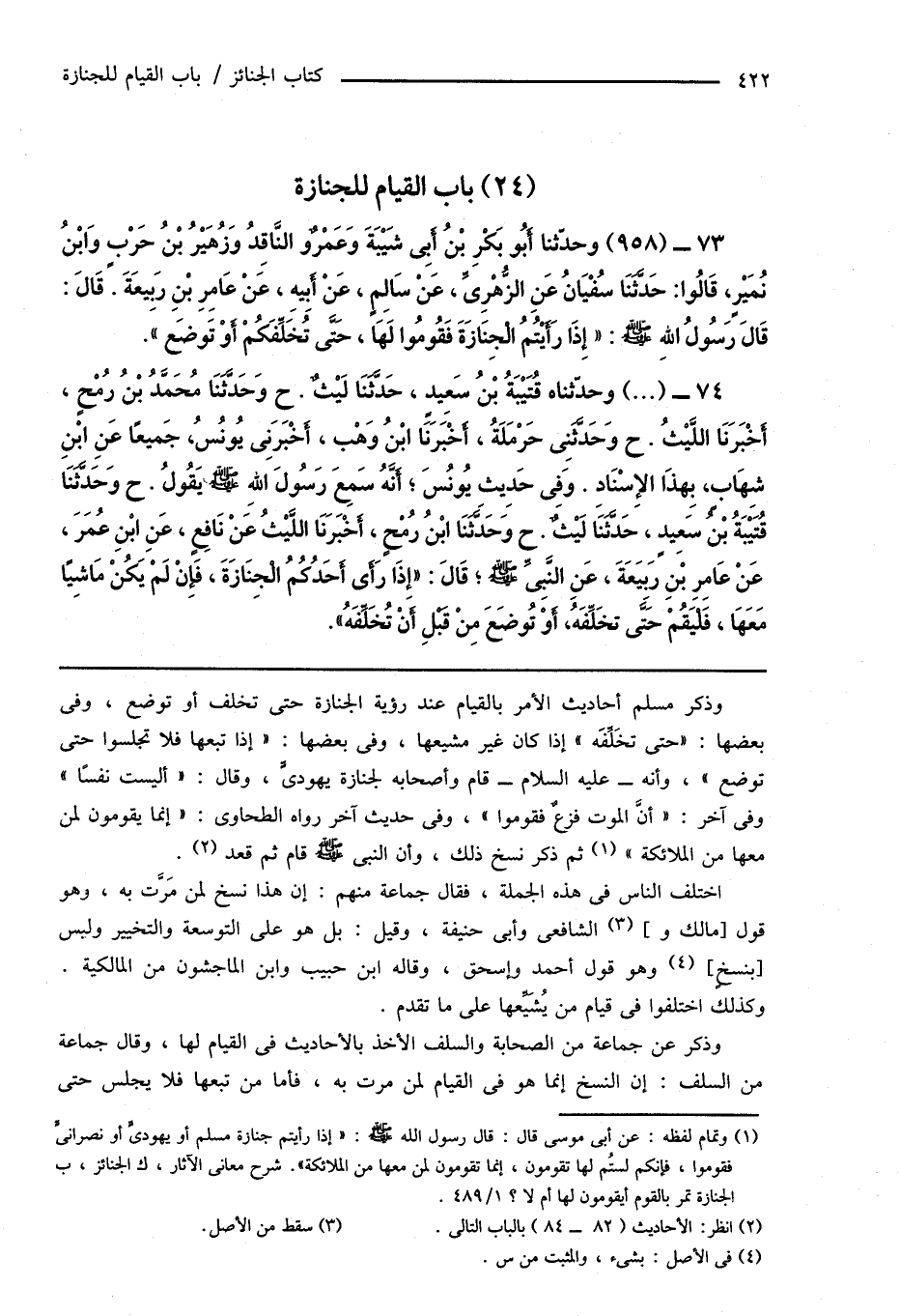 73 - (958) وحدّثنا أَبُو بَكْرِ بْنُ أَبِى شَيْبَةَ وَعَمْرٌو النَّاقِدُ وَزُهَيْرُ بْنُ حَرْبٍ وَابْنُ نُمَيْرٍ، قَالُوا: حَدَّثَنَا سُفْيَانُ عَنِ الزُّهْرِىِّ، عَنْ سَالِمٍ، عَن أَبِيهِ، عَنْ عَامِرِ بْنِ رَبِيعَةَ. قَالَ: قَالَ رَسُولُ اللهِ صَلَّى اللهُ عَلَيْهِ وَسَلَّمَ: " إِذَا رَأَيْتُمُ الْجِنَازَةَ فَقُومُوا لَهَا، حَتَّى تُخَلِّفَكُمْ أَوْ تَوضَع ".