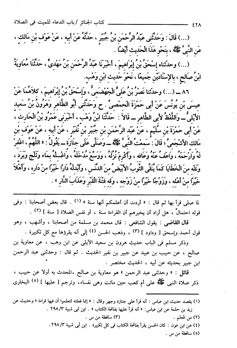 86 - (...) وحدّثنا نَصْرُ بْنُ عَلِىٍّ الْجْهْضَمِىِّ، وَإِسْحَاقُ بْنُ إِبْرَاهِيمَ، كِلَاهُمَا عَنْ عِيسَى بْنِ يُونُسَ عَنْ أَبِى حَمْزَةَ الْحِمْصِىِّ. ح وَحَدَّثَنِى أَبُو الطَّاهِرِ وَهَارُونُ بْنُ سَعِيدٍ الأَيْلِىُّ - وَاللَّفْظُ لأَبِى الطَّاهِرِ - قَالَا: حَدَّثَنَا ابْنُ وَهْبٍ، أَخْبَرَنِى عَمْرُو بْنُ الْحَارِثِ، عَنْ أَبِى حَمْزَةَ بْنِ سُلَيْمٍ، عَنْ عَبْدِ الرَّحْمَنِ بْنِ جُبَيْرِ بْنِ نُفَيْرٍ، عَنْ أَبِيهِ، عَنْ عَوْفِ بْنِ مَالِكٍ الأَشْجَعِىِّ؛ قَالَ: سَمِعْتُ النَّبِىَّ صَلَّى اللهُ عَلَيْهِ وَسَلَّمَ - وَصَلَّى عَلَى جِنَازَةٍ - يَقُولُ: " اللَّهُمَّ، اغْفِرْ لَهُ وَارْحَمْهُ، وَاعْفُ عَنْهُ وَعَافِهِ، وَأَكْرِمْ نُزُلَهُ، وَوَسِّعْ مُدْخَلَهُ، وَاغْسِلْهُ بِمَاء وَثَلْج وَبَرَدٍ، وَنَقْهِ مِنَ الْخَطَايَا كَمَا يُنَقَّى الثَّوبُ الأَبْيَضُ مِنَ الدَّنَسِ، وَأَبْدِلْهُ دَارًا خَيْرًا مِنْ دَارِهِ، وَأَهْلاً خَيْرًا مِنْ أَهْلِهِ، وَزَوْجًا خَيْرًا مِنْ زَوْجِهِ، وَقِهِ فِتْنَةَ الْقَبْرِ وَعَذَابَ النَّارِ ".