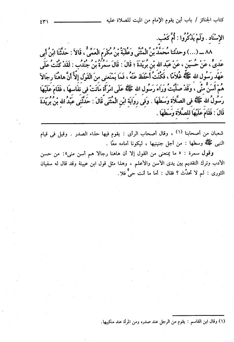 88 - (...) وحدّثنا مُحَمَّدُ بْنُ الْمُثَنَّى وَعُقْبَةُ بْنُ مُكْرَمٍ الْعَمِّىُّ، قَالَا: حَدَّثَنَا ابْنُ أَبِى عَدِىٍّ، عَنْ حُسَيْنٍ، عَنْ عَبْدِ اللهِ بْنِ بُرَيْدَةَ؛ قَالَ: قَالَ سَمُرَةُ بْنُ جُنْدُبٍ: لَقَدْ كُنْتُ عَلَى عَهْدِ رَسُولِ اللهِ صَلَّى اللهُ عَلَيْهِ وَسَلَّمَ غُلَامًا، فَكُنْتُ أَحْفَظ عَنْهُ، فَمَا يَمْنَعنِى مِنَ الْقَوْلِ إِلَّا أَنَّ هاهُنَا رِجَالاً هُمْ أَسَنُّ مِنِّى، وَقَدْ صَلَّيْتُ وَرَاءَ رَسُولِ اللهِ صَلَّى اللهُ عَلَيْهِ وَسَلَّمَ عَلَى امْرَأَةٍ مَاتَتْ فِى نِفَاسِهَا، فَقَامَ عَلَيْهَا رَسُولُ اللهِ صَلَّى اللهُ عَلَيْهِ وَسَلَّمَ فِى الصَّلَاةِ وَسَطَهَا. وَفِى رِوَايَةِ ابْنِ الْمُثَنَّى قَالَ: حَدَّثَنِى عَبْدُ اللهِ بْنُ بُريْدَةَ قَالَ: فَقَامَ عَلَيْهَا للِصَّلَاةِ وَسَطَهَا.