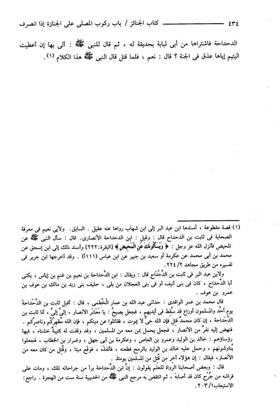 (¬1) قصة مقطوعة، أسندها ابن عبد البر إلى ابن شهاب رواها عنه عقيل. السابق. ولأبى نعيم فى معرفة الصحابة فى ثابت بن الدحداح قال: وقيل: ابن الدحداحة الأنصارى. قال: سأل النبى صَلَّى اللهُ عَلَيْهِ وَسَلَّمَ عن المحيض فأنزل الله عز وجل: {وَيَسْأَلُونَكَ عَنِ الْمَحِيضِ} [البقرة: 222] وأسند ذلك إلى ابن إسحاق عن محمد بن أبى محمد عن عكرمة أو سعيد بن جبير عن ابن عباس (111أ). وقد أخرجها ابن جرير فى تفسيره من طريق مجاهد 2/ 224.