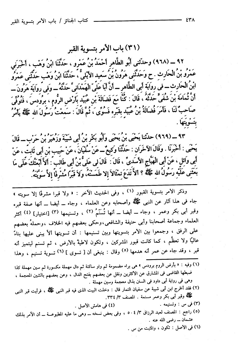 92 - (968) وحدَّثنى أَبُو الطَّاهِرِ أَحْمَدُ بْنُ عَمْرٍو، حَدَّثَنَا ابْنُ وَهْبٍ، أَخْبَرَنِى عَمْرُو بْنُ الْحَارِثِ. ح وَحَدَّثَنِى هَارُونُ بْنُ سَعِيدٍ الأَيْلِىُّ، حَدَّثَنَا ابْنُ وَهْبٍ حَدَّثَنِى عَمْرُو ابْنُ الْحَارِثِ - فى رِوَايَةِ أَبِى الطَّاهِرِ - أَنَّ أَبَا عَلِىّ الْهَمْدَانِىَّ حَدَّثَهُ - وَفِى رِوَايَةِ هَارُونَ - أَنَّ ثُمَامَة بْنَ شُفَىٍّ حَدَّثَهُ، قَالَ: كُنَّا مَعَ فَضَالَةَ بْنِ عُبَيْدٍ بَأرْضِ الرُّومِ، بِرُودِسَ، فَتُوُفِّىَ صَاحِبٌ لَنَا، فَأَمَرَ فُضَالَةُ بْنُ عُبَيْدٍ بِقَبْرِهِ فَسُوِّىَ، ثُمَّ قَالَ: سَمِعْتُ رَسُولَ اللهِ صَلَّى اللهُ عَلَيْهِ وَسَلَّمَ يَأْمُرُ بِتَسْوِيَتِهَا.