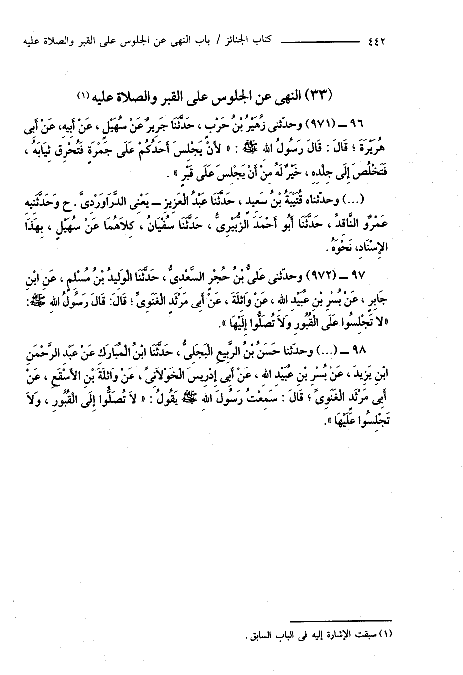 98 - (...) وحدّثنا حَسَنُ بْنُ الرَّبِيعِ الْبَجَلِىُّ، حَدَّثَنَا ابْنُ الْمُبَارَكِ عَنْ عَبْدِ الرَّحْمَنِ ابْنِ يَزِيدَ، عَنْ بُسْرِ بْنِ عُبَيْدِ اللهِ، عَنْ أَبِى إِدْرِيسَ الْخَوْلَانِىِّ، عَنْ وَاثِلَةَ بْنِ الأَسْقَعِ، عَنْ أَبِى مَرْثَدٍ الْغَنَوِىِّ؛ قَالَ: سَمِعْتُ رَسُولَ اللهِ صَلَّى اللهُ عَلَيْهِ وَسَلَّمَ يَقُولُ: " لَا تُصَلُّوا إِلَى الْقُبُورِ، وَلَا تَجْلِسُوا عَلَيْهَا ".