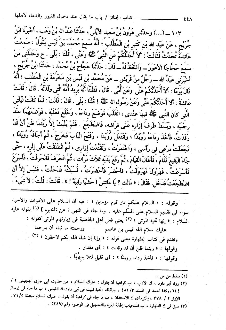 103 - (...) وحدَّثنى هَارُونُ بْنُ سَعِيدٍ الأَيْلِىُّ، حَدَّثَنَا عَبْدُ اللهِ بْنُ وَهْبٍ، أَخْبَرَنَا ابْنُ جُرَيْجٍ، عَنْ عَبْدِ اللهِ بْنِ كَثِيرِ بْنِ الْمُطَّلِبِ؛ أَنَّهُ سَمِعَ مُحَمَّدَ بْنَ قَيْسٍ يَقُولُ: سَمِعْتُ عَائِشَةَ تُحَدِّثُ فَقَالَتْ: أَلَا أُحَدِّثُكُمْ عَنِ النَّبِىِّ صَلَّى اللهُ عَلَيْهِ وَسَلَّمَ وَعَنِّى، قُلْنَا: بَلَى. ح وَحَدَّثَنِى مَنْ سَمِعَ حَجَّاجًا الأَعْوَرَ - وَاللَّفْظُ لَهُ - قَالَ: حَدَّثَنَا حَجَّاجُ بْنُ مُحَمَّدٍ، حَدَّثَنَا ابْنُ جُرَيْجٍ، أَخْبَرَنِى عَبْدُ اللهِ - رَجُلٌ منْ قَرَيْشٍ - عَنْ مُحَمَّدِ بْنِ قَيْسٍ بْنِ مَخْرَمَةَ بْنِ الْمُطَّلِبِ؛ أَنَّهُ قَالَ يَوْمًا: أَلَا أُحَدِّثُكُمْ عَنِّى وَعَنْ أُمِّى. قَالَ، فَظَنَنَّا أَنَّهُ يُرِيدُ أُمَّهُ الَّتِى وَلَدَتْهُ. قَالَ: قَالَتْ عَائِشَةُ: أَلَا أُحَدِّثُكُمْ عَنِّى وَعَنْ رَسُولِ اللهِ صَلَّى اللهُ عَلَيْهِ وَسَلَّمَ! قُلْنَا: بَلَى. قَالَ: قَالَتْ: لَمَّا كَانَتْ لَيْلَتِى الَّتِى كَانَ النَّبِىُّ صَلَّى اللهُ عَلَيْهِ وَسَلَّمَ فِيهَا عِنْدِى، انْقَلَبَ فَوَضَعَ رِدَاءَهُ، وَخَلَعَ نَعْلَيْهِ، فَوَضَعَهُمَا عِنْدَ رِجْلَيْهِ، وَبَسَطَ طَرفَ إِزَارِهِ عَلَى فِرَاشِهِ، فَاضْطَجَعَ. فَلَمْ يَلْبَثْ إِلَّا رَيْثَمَا ظَنَّ أَنْ قَدْ رَقَدْتُ، فَأَخَذَ رِدَاءَهُ رُوَيْدًا، وَانْتَعَلَ رُوَيْدًا، وَفَتَحَ الْبَابَ فَخَرَجَ، ثُمَّ أَجَافَهُ رُوَيْدًا، فَجَعَلْتُ دِرْعِى فى رَأسِى، وَاخْتَمَرْتُ، وَتَقَنَّعْتُ إِزَارِى، ثُمَّ انْطَلَقْتُ عَلَى إِثْرِهِ، حَتَّى جَاءَ الْبَقِيعَ فَقَامَ، فَأَطَالَ الْقِيَامَ، ثُمَّ رَفَعَ يَدَيْهِ ثَلَاثَ مَرَّاتٍ، ثُمَّ انْحَرَفَ فَانْحَرفْتُ، فَأَسْرَعَ فَأَسْرَعْتُ، فَهَرْوَلَ فَهَرْوَلْتُ، فَأَحْضَرَ فَأَحْضَرَتُ، فَسَبَقْتُهُ فَدَخَلْتُ، فَلَيْسَ إِلَّا أَنِ اضْطَجَعْتُ فَدَخَل. فَقَالَ: " مَالَكِ؟ يَا عَائِشُ! حَشْيَا رَابِيَةً! ". قَالَتْ: قُلْتُ: لَا شَىءَ.