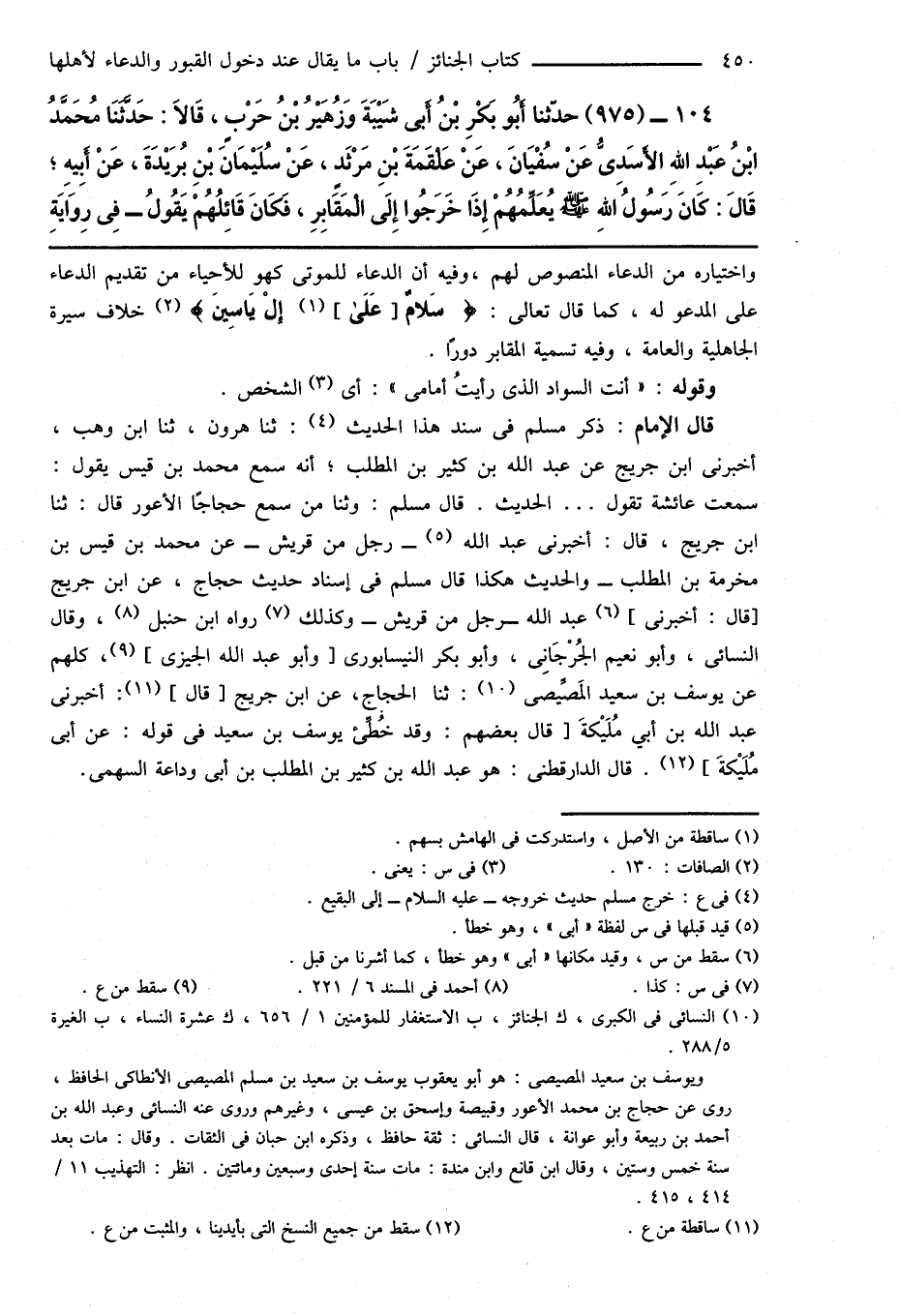 104 - (975) حدّثنا أَبُو بَكْرِ بْنُ أَبى شَيْبَةَ وَزُهَيْرُ بْنُ حَرْبٍ، قَالَا: حَدَّثَنَا مُحَمَّدُ ابْنُ عَبْدِ اللهِ الأَسَدِىُّ عَنْ سُفْيَانَ، عَنْ عَلْقَمَةَ بْنِ مَرْثَدٍ، عَنْ سُلَيْمَانَ بْنِ بُرَيْدَةَ، عَنْ أَبِيهِ؛ قَالَ: كَانَ رَسُولُ اللهِ صَلَّى اللهُ عَلَيْهِ وَسَلَّمَ يُعَلِّمُهُمْ إِذَا خَرَجُوا إِلَى الْمَقَابِرِ، فَكَانَ قَائِلُهُمْ يَقُولُ - فِى رِوَايَةِ