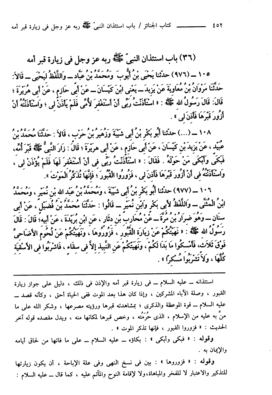 108 - (...) حدّثنا أَبُو بَكْرِ بْنُ أَبِى شَيْبَةَ وَزُهَيرُ بْنُ حَرْبٍ، قَالَا: حَدَّثَنَا مُحَمَّدُ بْنُ عُبَيْدٍ، عَنْ يَزِيدَ بْنِ كَيْسَانَ، عَنْ أَبِى حَازِمٍ، عَنْ أَبِى هُرَيْرَةَ؛ قَالَ: زَارَ النَّبِىُّ صَلَّى اللهُ عَلَيْهِ وَسَلَّمَ قَبْرَ أُمِّهِ، فَبَكَى وَأَبْكَى مَنْ حَوْلَهُ. فَقَالَ: " اسْتَأْذَنْتُ رَبِّى فِى أَنْ أَسْتَغْفِرَ لَهَا فَلَمْ يُؤْذَنْ لِىَ، وَاسْتَأْذَنْتُهُ فِى أَنْ أَزُورَ قَبْرَهَا فَأَذِنَ لِى، فَزُورُوا الْقُبُورَ؛ فَإِنَّهَا تُذَكِّرُ الْمَوْتَ ".