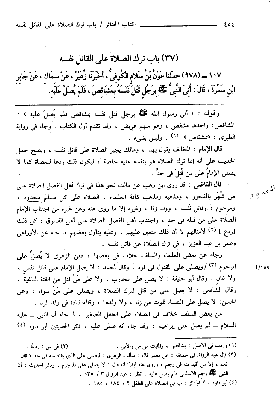 107 - (978) حدّثنا عَوْنُ بْنُ سَلامٍ الْكُوفِىُّ، أَخْبَرَنَا زُهَيْرٌ، عَنْ سِمَاكٍ، عَنْ جَابِرِ ابْنِ سَمُرَةَ، قَالَ: أُتِىَ النَّبِىُّ صَلَّى اللهُ عَلَيْهِ وَسَلَّمَ بِرَجُلٍ قَتَلَ نَفْسَهُ بِمَشَاقِصَ، فَلَمْ يُصَلِّ عَلَيْهِ.