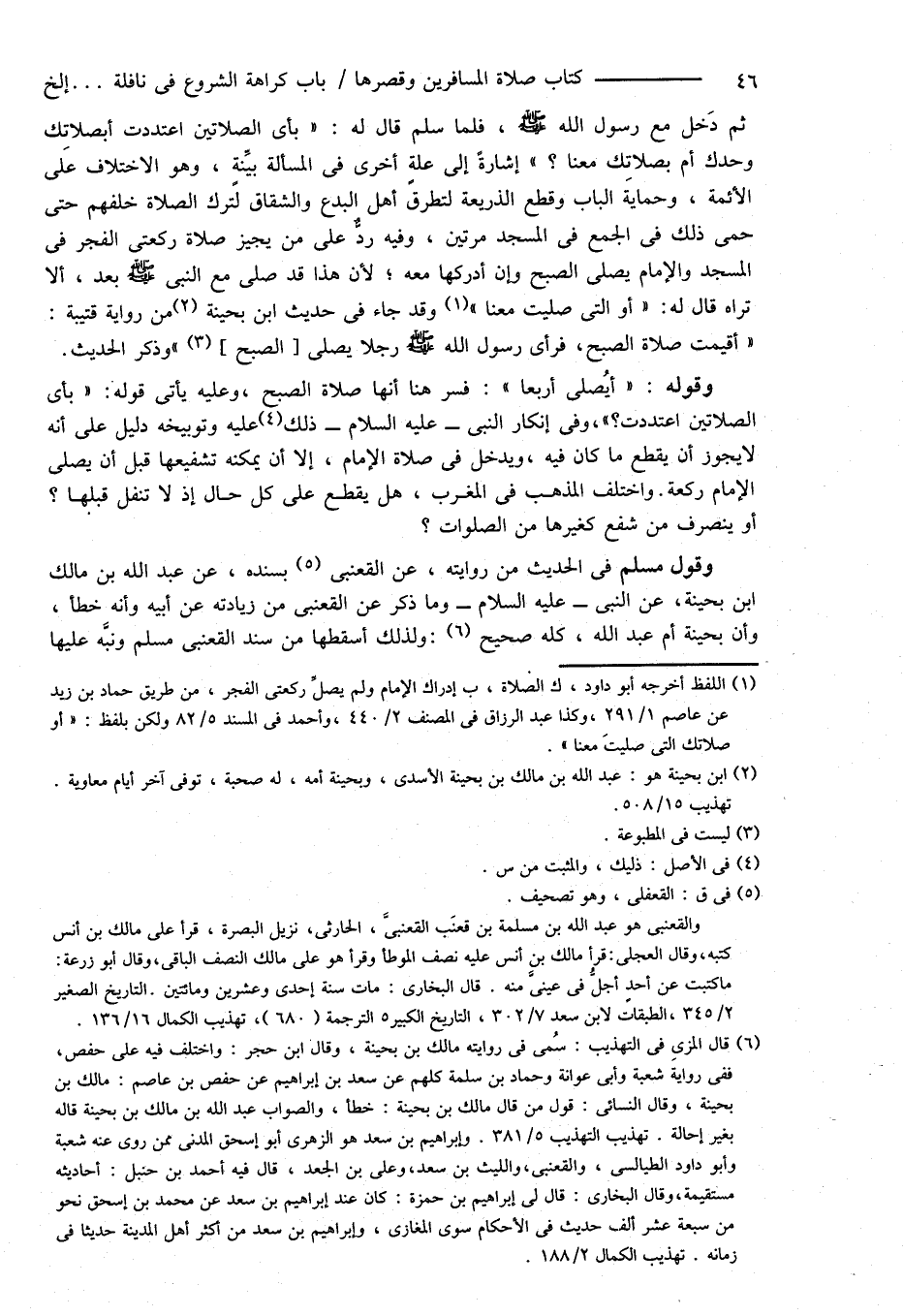 ابن بحينة، عن النبى - عليه السلام - وما ذكر عن القعنبى من زيادته عن أبيه وأنه خطأ، وأن بحينة أم عبد الله، كله صحيح (¬6): ولذلك أسقطها من سند القعنبى مسلم ونبَّه عليها