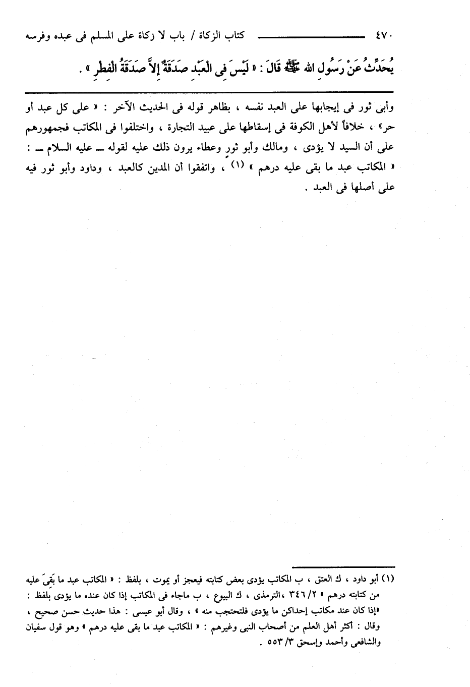 (¬1) أبو داود، ك العتق، ب المكاتب يؤدى بعض كابته فيعجز أو يموت، بلفظ: " المكاتب عبد ما بَقِىَ عليه من كتابته درهم " 2/ 346، الترمذى، ك البيوع، ب ما جاء فى المكاتب إذا كان عنده ما يؤدى بلفظ: " إذا كان عند مكاتب إحداكن ما يؤدى فلتحتجب منه "، وقال أبو عيسى: هذا حديث حسن صحيح، وقال: أكثر أهل العلم من أصحاب النبى وغيرهم: " المكاتب عبد ما بقى عليه درهم " وهو قول سفيان والشافعى وأحمد وإسحاق 3/ 553.