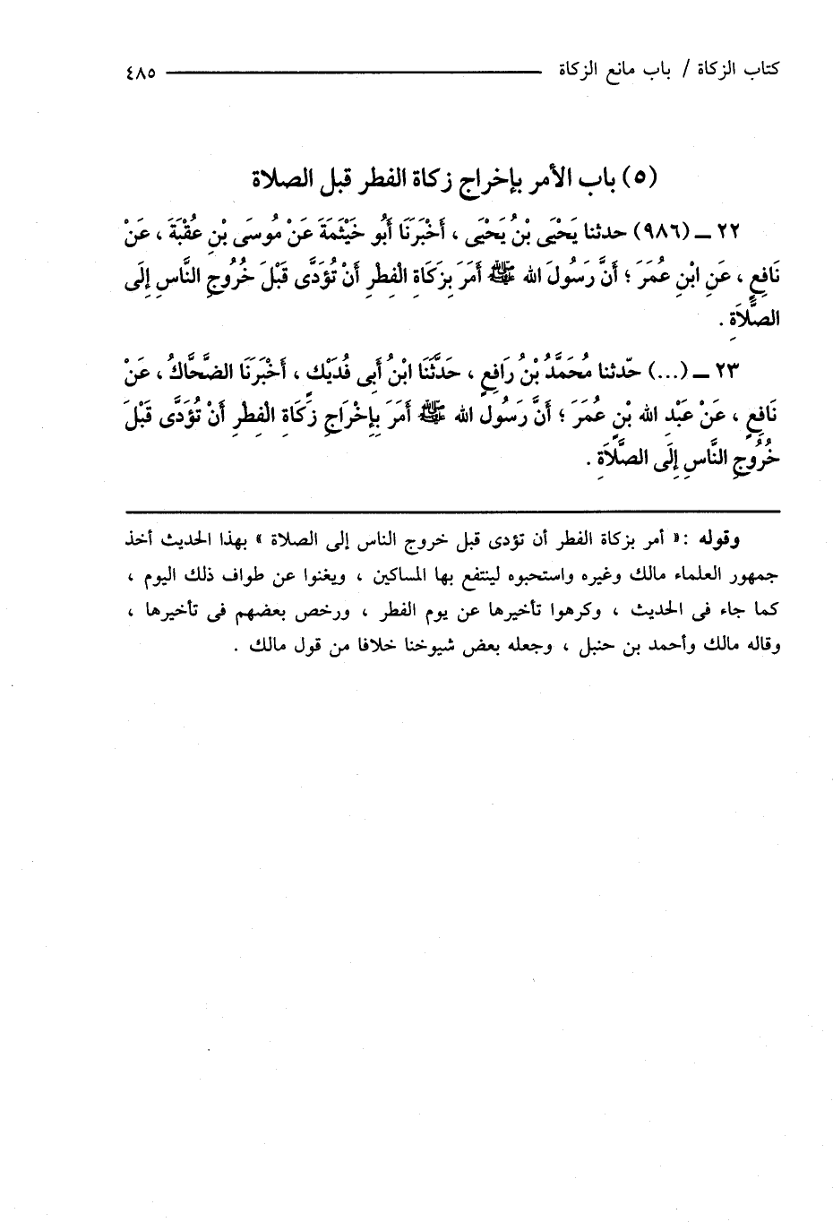 22 - (986) حدثنا يَحْيَى بْنُ يَحْيَى، أَخْبَرَنَا أَبُو خَيْثَمَةَ عَنْ مُوسَى بْنِ عُقْبَةَ، عَنْ نَافِعٍ، عَنِ ابْنِ عُمَرَ؛ أَنَّ رَسُولَ اللهِ صَلَّى اللهُ عَلَيْهِ وَسَلَّمَ أَمَرَ بِزَكَاةِ الْفِطْرِ أَنْ تُؤَدَّى قَبْلَ خُرُوجِ النَّاسِ إِلَى الصَّلَاةِ.