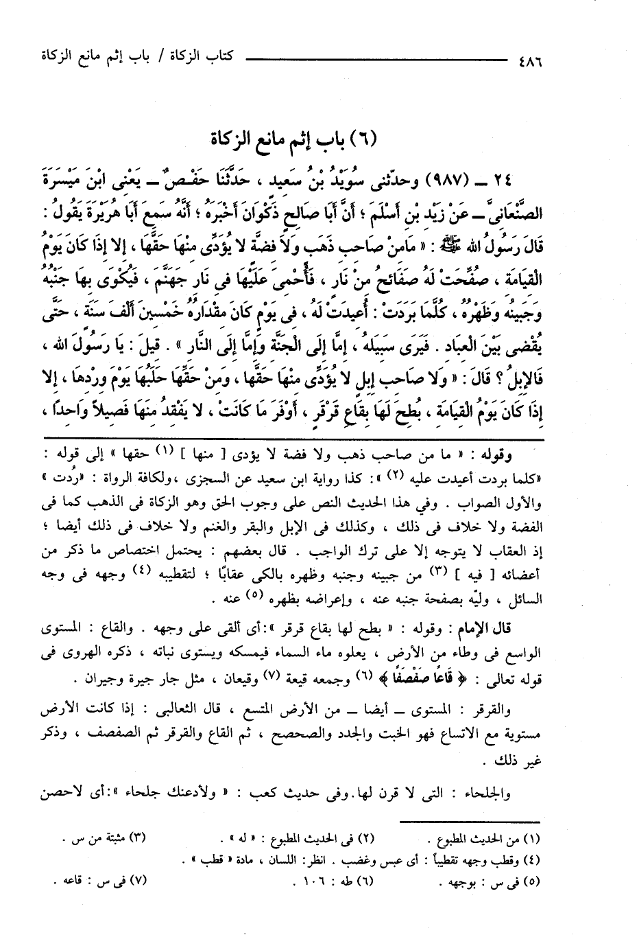 24 - (987) وحدَّثنى سُوَيْدُ بْنُ سَعِيدٍ، حَدَّثَنَا حَفْصٌ - يَعْنِى ابْنَ مَيْسَرَةَ الصَّنْعَانِىَّ - عَنْ زَيْدِ بْنِ أَسْلَمَ؛ أَنَّ أَبَا صَالِحٍ ذَكوَانَ أَخْبَرَهُ؛ أَنَّهُ سَمِعَ أَبَا هَرَيْرَةَ يَقُولُ: قَالَ رَسُولُ اللهِ صَلَّى اللهُ عَلَيْهِ وَسَلَّمَ: " مَا مِنْ صَاحِبِ ذَهَبٍ وَلَا فِضَّةٍ لا يُؤَدِّى مِنْهَا حَقَّهَا، إِلا إِذَا كَانَ يَوْمُ الْقِيَامَةِ، صُفِّحَتْ لَهُ صَفَائحُ مِنْ نَارٍ، فَأُحْمِىَ عَلَيْهَا فِى نَارِ جَهَنَّمَ، فَيُكْوَى بِهَا جَنْبُهُ وَجَبينُه وَظَهْرُهُ، كُلَّمَا بَرَدَتْ: أُعِيدَتْ لَهُ، فِى يَوْمٍ كَانَ مِقْدَارُهُ خَمْسِينَ أَلْفَ سَنَةٍ، حَتَّى يُقْضى بَيْنَ الْعِبَادِ. فَيَرَى سَبِيَلهُ، إِمَّا إِلَى الْجَنَّةِ وَإِمَّا إِلَى النَّارِ ". قِيلَ: يَا رَسُولَ اللهِ، فَالإِبِلُ؟ قَالَ: " وَلا صَاحِب إِبِلٍ لا يُؤَدِّى مِنْهَا حَقَّهَا، وَمِنْ حَقِّهَا حَلَبُهَا يَوْمَ وِرْدِهَا، إِلا إِذَا كَانَ يَوْمُ الْقِيَامَةِ، بُطِحَ لَهَا بِقَاعِ قَرْقَرٍ، أَوْفَرَ مَا كَانَتْ، لا يَفْقِدُ مِنَهَا فَصِيلاً وَاحِدًا،