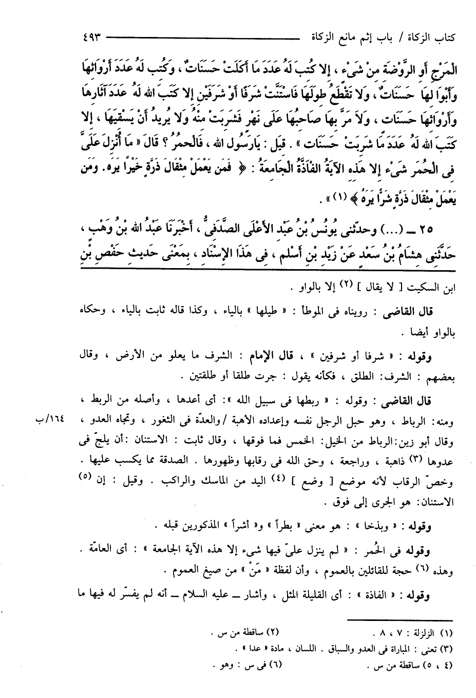 الْمَرْجِ أَوِ الرَّوْضَةِ مِنْ شَىْءٍ، إِلا كُتِبَ لَهُ عَدَدَ مَا أَكَلَتْ حَسَنَاتٌ، وَكُتِب لَهُ عَدَدَ أَرْوَاثِهَا وَأَبْوَالِهَا حَسَنَاتٌ، وَلا تَقْطَعُ طِوَلَهَا فَاسْتَنَّتْ شَرَفًا أَوْ شَرَفَيْنِ إِلا كَتَبَ الله لَهُ عَدَدَ آثَارِهَا وَأَرْوَاثِهَا حَسَنَاتٍ، وَلا مَرَّ بِهَا صَاحِبُهَا عَلَى نَهْرٍ فَشَرِبَتْ مِنْهُ وَلا يُريدُ أَنْ يَسْقِيَهَا، إِلا كَتَبَ الله لَهُ عَدَدَ مَا شَرِبَتْ حَسَنَات ". قيَل: يَا رَسُول الله، فَالْحمُرُ؟ قَالَ " مَا أُنْزِلَ عَلَىَّ فِى الْحُمر شَىْء إِلا هَذِهِ الآيَةُ الْفَاذَّةُ الْجَامِعَةُ: {فَمَن يَعْمَلْ مِثْقَالَ ذَرَّةٍ خَيْرًا يَرَه. وَمَن يَعْمَلْ مِثْقَالَ ذَرَّةٍ شَرًا يَرَهُ} (¬1) ".