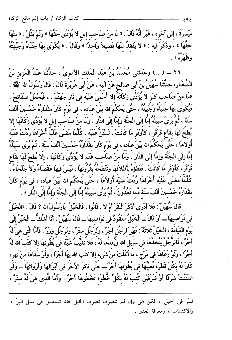 26 - (...) وحّدثنى مُحَمَّدُ بْنُ عَبْدِ الْمَلِكِ الأُمَوِىُّ، حَدَّثَنَا عَبْدُ الْعَزِيزِ بْنُ الْمُخْتَارِ، حَدَّثَنَا سُهَيْلُ بْنُ أَبِى صَالِحٍ عَنْ أَبِيهِ، عَنْ أَبِى هُرَيْرَةَ قَالَ: قَالَ رَسُولُ اللهِ صَلَّى اللهُ عَلَيْهِ وَسَلَّمَ: " مَا مِنْ صَاحِبِ كَنْزٍ لا يُؤَدِّى زَكَاتَهُ إِلا أُحْمِىَ عَلَيْهِ فِى نَارِ جَهَنَّمَ، فَيُجْعَلُ صَفَائِحَ. فَيُكْوَى بِهَا جَنبَاهُ وَجَبِينُهُ، حَتَّى يَحْكُمَ الله بَيْنَ عِبَادِهِ، فِى يَوْمٍ كَانَ مِقْدَارُهُ خَمْسِينَ أَلْفَ سَنَةٍ، ثُمَّ يَرىَ سَبِيَلُهُ إِمَّا إِلَى الْجَنَّةِ وَإِمَّا إِلَى النَّارِ. وَمَا مِنْ صَاحِبِ إِبِلٍ لا يُؤَدِّى زَكَاتَهَا إِلا بُطِحَ لَهَا بِقَاعٍ قَرْقَرٍ، كَأَوْفَرِ مَا كَانَتْ، تَسْتَنُّ عَلَيْهِ، كُلَّمَا مَضَى عَلَيْهِ أُخْرَاهَا رُدَّتْ عَلَيْهِ أُولاهَا، حَتَّى يَحْكُمَ الله بَيْنَ عِبَادِهِ، فِى يَوْمٍ كَانَ مِقْدَارُهُ خَمْسِينَ أَلْفَ سَنَةٍ، ثُمَّ يُرَى سَبِيَلُهُ إِمَّا إِلَى الْجَنَّةِ وَإِمَّا إِلَى النَّارِ. وَمَا مِنْ صَاحِبِ غَنَمٍ لا يُؤَدِّى زَكَاتَهَا، إِلا بُطِحَ لَهَا بِقَاعٍ قَرْقَرٍ، كَأَوْفَرِ مَا كَانَتْ. فَتَطَؤهُ بِأَظْلَافِهَا وَتَنْطِحُهُ بِقُرُونِهَا، لَيْسَ فِيهَا عَقْصَاءُ وَلَا جَلْحَاءُ، كُلَّمَا مَضَى عَلَيْهِ أُخْرَاهَا رُدَّتْ عَلَيْهِ أُولَاهَا، حَتَّى يَحْكُمَ الله بَيْنَ عِبَادِهِ، فِى يَوْمٍ كَانَ مِقْدَارُهُ خَمْسِينَ أَلْفَ سَنَةٍ ممِا تَعُدُّونَ، ثُمَّ يَرُى سَبيَلُهُ إِمَّا إِلَى الْجَنَّةِ وَإِمَّا إِلَى النَّار ".