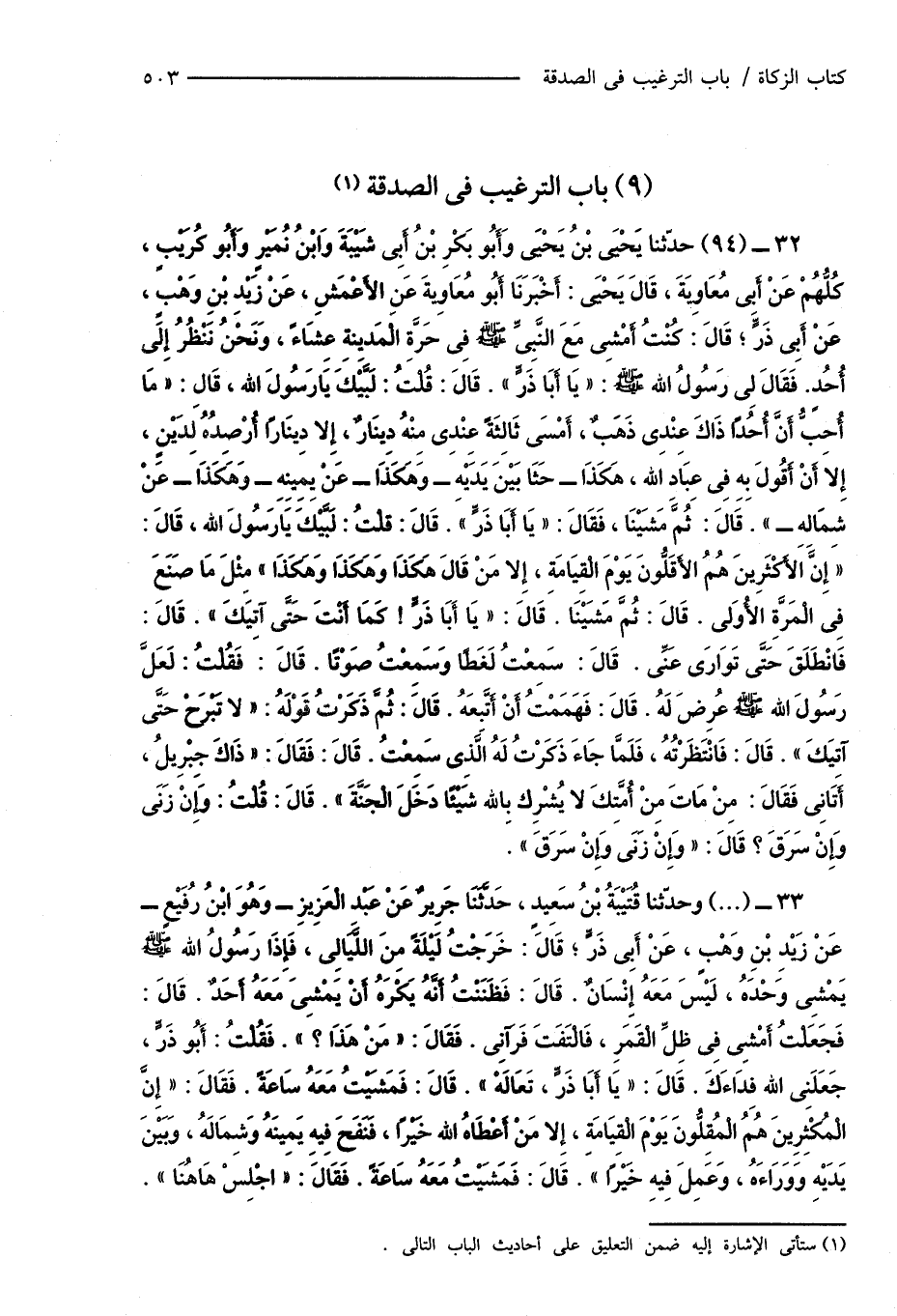 33 - (...) وحدّثنا قُتَيْبَةُ بْنُ سَعِيدٍ، حَدَّثَنَا جَرِيرٌ عَنْ عَبْدِ الْعَزِيزِ - وَهُوَ ابْنُ رُفَيْعٍ - عَنْ زَيْدِ بْنِ وَهْبٍ، عَنْ أَبِى ذَرٍّ؛ قَالَ: خَرَجْتُ لَيْلَةً مِنَ اللَّيَالِى، فَإِذَا رَسُولُ اللهِ صَلَّى اللهُ عَلَيْهِ وَسَلَّمَ يَمْشِى وَحْدَهُ، لَيْسَ مَعَهُ إِنْسَانٌ. قَالَ: فَظَنَنْتُ أَنَّهُ يَكْرَهُ أَنْ يَمْشِىَ مَعَهُ أَحَدٌ. قَالَ: فَجَعَلْتُ أَمْشِى فِى ظِلِّ الْقَمَرِ، فَالْتَفَتَ فَرَآنِى. فَقَالَ: " مَنْ هَذَا؟ ". فَقُلْتُ: أَبُو ذَرٍّ، جَعَلَنِى الله فِدَاءَكَ. قَالَ: " يَا أَبَا ذَرٍّ، تَعَالَهْ ". قَالَ: فَمَشَيْتُ مَعَهُ سَاعَةً. فَقَالَ: " إِنَّ الْمُكْثِرِينَ هُمُ الْمُقِلُّونَ يَوْمَ الْقِيَامَةِ، إِلا مَنْ أَعْطَاهُ الله خَيْرًا، فنَفَحَ فِيهِ يَمِينَهُ وَشِمَالَهُ، وَبَيْنَ يَدَيْهِ وَوَرَاءَهُ، وَعَمِلَ فِيهِ خَيْرًا ". قَالَ: فَمَشَيْتُ مَعَهُ سَاعَةً. فَقَالَ: " اجْلِسْ هَاهُنَا ".
