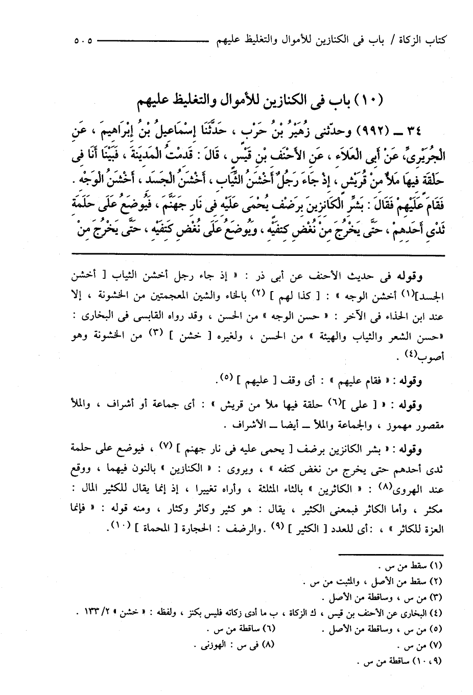 34 - (992) وحدَّثنى زهُيْرُ بْنُ حَرْبٍ، حَدَّثَنَا إِسْمَاعِيلُ بْنُ إِبْرَاهِيمَ، عَنِ الْجُرَيْرِىِّ، عَنْ أَبِى الْعَلَاءِ، عَنِ الأَحْنَفِ بْنِ قَيْسٍ، قَالَ: قَدِمْتُ الْمَدِينَةَ، فَبَيْنَا أَنَا فِى حَلْقَةٍ فِيهَا مَلأٌ مِنْ قُرَيْشٍ، إِذْ جَاءَ رَجُلٌ أَخْشَنُ الثِّيَابِ، أَخْشَنُ الْجَسَدِ، أَخْشَنُ الْوَجْهِ. فَقَامَ كَلَيْهِمْ فَقَالَ: بَشِّرِ الْكَانِزِينَ بِرَضْفٍ يُحْمَى عَلَيْهِ فِى نَارِ جَهَنَّمَ، فَيُوضِعُ عَلَى حَلَمَةِ ثَدْىِ أَحَدِهِمْ، حَتَّى يَخْرُجَ مِنْ نُغْضِ كَتِفَيْهِ، وَيُوضَعُ عَلَى نُغْضِ كَتِفَيْهِ، حتى يَخْرُجَ مِنْ