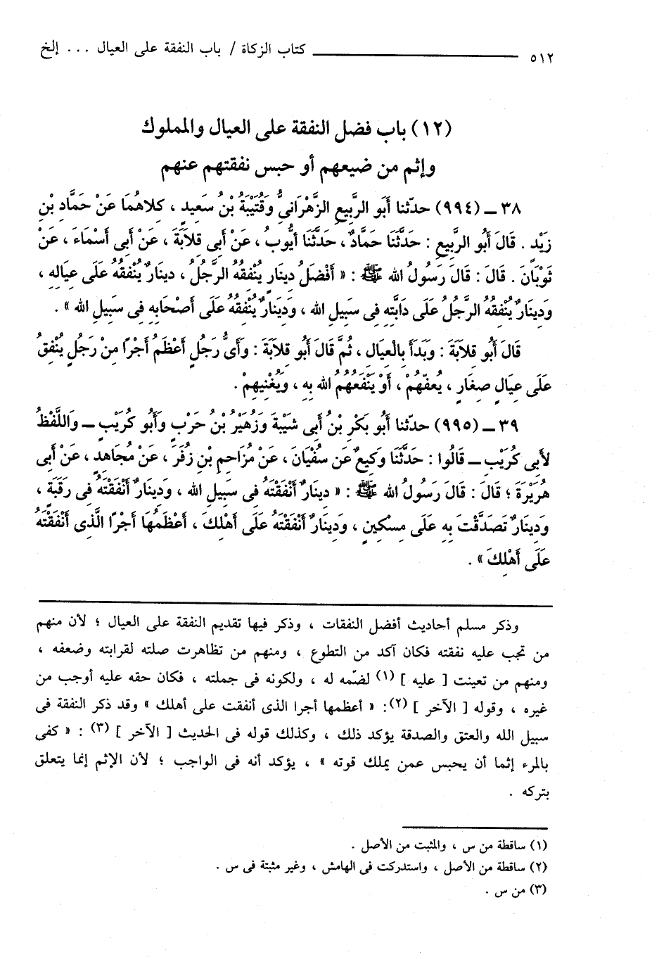 38 - (994) حدّثنا أَبَو الرَّبِيعِ الرَّهْرَانِىُّ وَقُتَيْبَةُ بْنُ سَعِيدٍ، كِلاهُمَا عَنْ حَمَّادِ بْنِ زَيْدٍ. قَالَ أَبُو الرَّبِيعِ: حَدَّثَنَا حَمَّادٌ، حَدَّثَنَا أَيُّوبُ، عَنْ أَبِى قِلَابَةَ، عَنْ أَبِى أَسْمَاءَ، عَنْ ثَوْبَانَ. قَالَ: قَالَ رسُولُ اللهِ صَلَّى اللهُ عَلَيْهِ وَسَلَّمَ: " أَفْضَلُ دِينَارٍ يُنْفِقُهُ الرَّجُلُ، دِينَارٌ يُنْفِقُهُ عَلَى عِيَالِهِ، وَدِينَارٌ يُنْفِقُهُ الرَّجُلُ عَلَى دَابَّتِهِ فِى سَبِيلِ اللهِ، وَدِيَنارٌ يُنْفِقُهُ عَلَى أَصْحَابِهِ فِى سَبِيلِ اللهِ ".