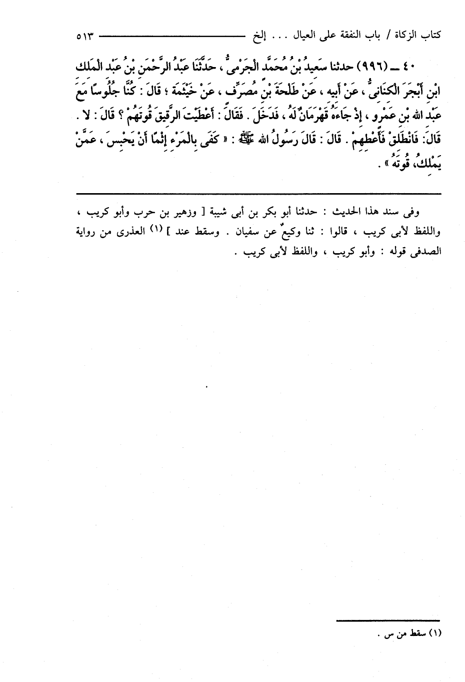 40 - (996) حدثنا سَعِيدُ بْنُ مُحَمَّدٍ الْجَرْمِىُّ، حَدَّثَنَا عَبْدُ الرَّحْمَنِ بْنُ عَبْدِ الْمَلِكِ ابْنِ أَبْجَرَ الْكِنَانِىُّ، عَنْ أَبِيهِ، عَنْ طَلْحَةَ بْنِ مُصَرِّفٍ، عَنْ خَيْثَمَة؛ قَالَ: كُنَّا جُلُوَسًا مَعَ عَبْدِ اللهِ بْنِ عَمْرٍو، إِذْ جَاءَهُ قَهْرَمَانٌ لَهُ، فَدَخَلَ. فَقَال: أَعْطَيْتَ الرَّقِيقَ قُوتَهُمْ؟ قَالَ: لا. قَالَ: فَانْطَلِقْ فَأَعْطِهِمْ. قَالَ: قَالَ رَسُولُ اللهِ صَلَّى اللهُ عَلَيْهِ وَسَلَّمَ: " كَفَى بِالْمَرْءِ إِثْمًا أَنْ يَحْبِسَ، عَمَنْ يَمْلِكُ، قُوتَهُ ".