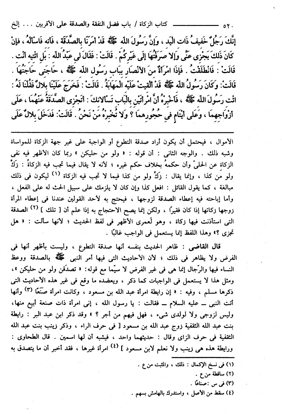 قال القاضى: ظاهر الحديث بنفسه أنها صدقة التطوع، وليست بأظهر أنها فى الفرض ولا يظاهر فى ذلك؛ لأن الأحاديث التى فيها أمر النبى صَلَّى اللهُ عَلَيْهِ وَسَلَّمَ بالصدقة ووعظ النساء فيها والرّجال إنما هى فى غير الفرض لا سيّما مع قوله: " تصدقن ولو من حليكن "، ومثل هذا لا يستعمل فى الواجبات كما ذكر، ويعضده ما وقع فى غير هذه الأحاديث التى ذكرها مسلم، وفيه: " إن رايطة امرأة عبد الله بن مسعود، وكانت امرأة صَنَعًا (¬3) وأنها أتت النبى - عليه السلام - فقالت: يا رسول الله، إنى امرأة ذات صنعة أبيع منها، وليس لزوجى ولا لولدى شىء، فهل فيهم من أجر؟ " وقد ذكر ابن عبد البر: رايطة بنت عبد الله الثقفية زوج عبد الله بن مسعود [فى حرف الراء، وذكر زينب بنت عبد الله الثقفية فى حرف الزاى وقال: حديثهما واحد، فيشبه أن لها اسمين. قال الطحاوى: ورايطة هذه هى زينب ولا نعلم لابن مسعود] (¬4) امرأة غيرها، فقد أخبر أن ما يتصدق به