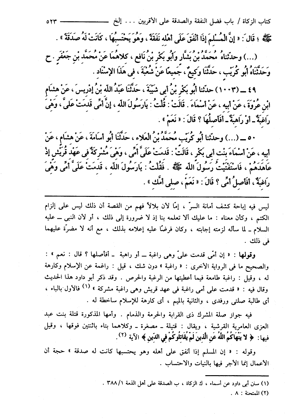 50 - (...) وحدّثنا أَبُو كُرَيْبٍ مُحَمَّدُ بْنُ الْعَلاءِ، حَدَّثَنَا أَبُو أُسَامَةَ، عَنْ هِشَامٍ، عَنْ أَبِيهِ، عَنْ أَسْمَاءَ بِنْتِ أَبِى بَكْرٍ، قَالَتْ: قَدِمَتْ عَلَىَّ أُمِّى، وَهِىَ مُشْرِكَةٌ فِى عَهْدِ قُرَيْشٍ إذْ عَاهَدَهُمْ، فَاسْتَفْتَيْتُ رَسُولَ اللهِ صَلَّى اللهُ عَلَيْهِ وَسَلَّمَ. فَقُلْتُ: يَا رَسُولَ اللهِ، قَدِمَتْ عَلَىَّ أُمِّى وَهِىَ رَاغِبَةٌ، أفَأصِلُ أُمِّى؟ قَالَ: " نَعَمْ، صِلِى أمَّكِ ".
