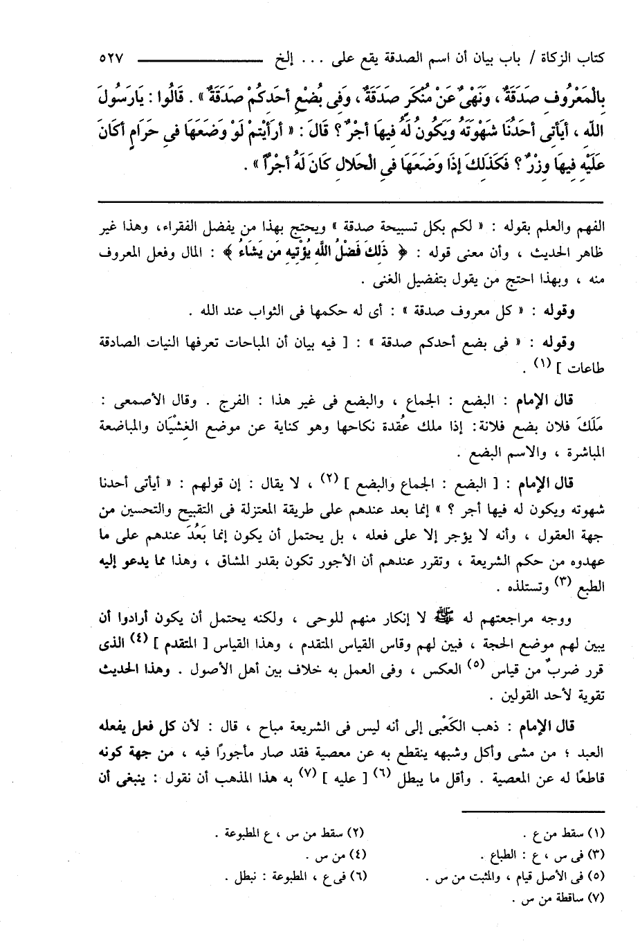 بِالْمَعْرُوفِ صَدَقَةٌ، وَنَهْىٌ عَنْ منكَرٍ صَدَقَةٌ، وَفِى بُضْعِ أحَدِكُمْ صَدَقَةٌ ". قَالُوا: يَا رَسُولَ اللهِ، أيَأتِى أحَدُنَا شَهْوَتَهُ وَيَكُونُ لَهُ فِيهَا أَجْرٌ؟ قَالَ: " أرَأيْتمْ لَوْ وَضَعَهَا فِى حَرَامٍ أَكَانَ عَلَيْهِ فِيهَا وِزْرٌ؟ فَكَذَلِكَ إِذَا وَضَعَهَا فِى الْحَلالِ كَانَ لَهُ أجْرٌ ".