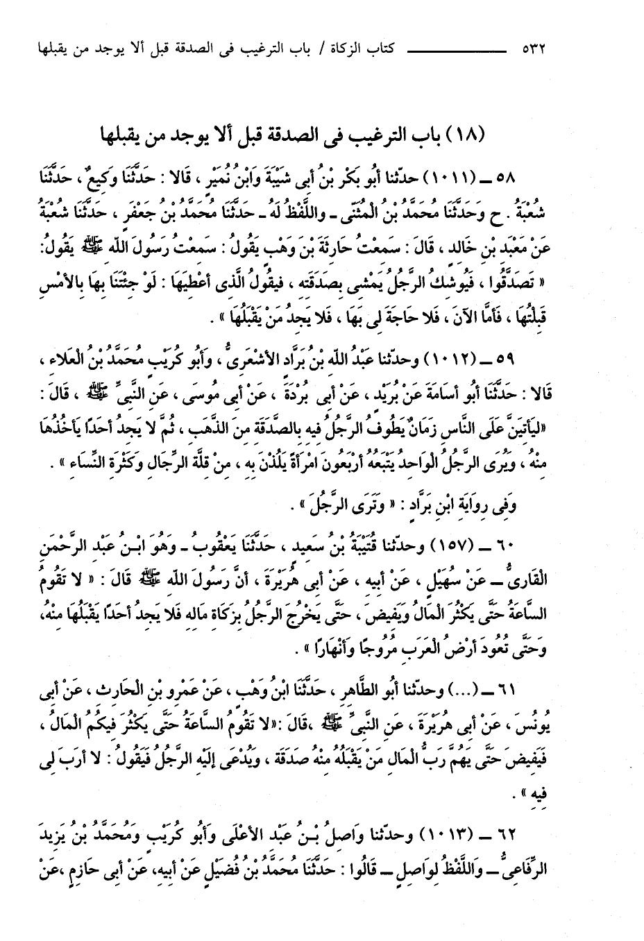 58 - (1011) حدّثنا أَبُو بَكْر بْنُ أَبِى شَيْبَةَ وَابْنُ نُمَيْرٍ، قَالا: حَدَّثَنَا وَكِيعٌ، حَدَّثَنَا شُعْبَةُ. ح وَحَدَّثَنَا مُحَمَّدُ بْنُ الْمُثَنَّى - وَاللَّفْظُ لَهُ - حَدَّثَنَا مُحَمَّدُ بْنُ جَعْفَرٍ، حَدَّثَنَا شُعْبَةُ عَنْ مَعْبَدِ بْنِ خَالِدٍ، قَالَ: سَمِعْتُ حَارِثَةَ بْنَ وَهْبٍ يَقُولُ: سَمِعْتُ رَسُولَ اللهِ صَلَّى اللهُ عَلَيْهِ وَسَلَّمَ يَقُولُ: " تَصَدَّقُوا، فَيُوشِكُ الرَّجُلُ يَمْشِى بِصَدَقَتِهِ، فيقُولُ الَّذِى أعْطِيَهَا: لَوْ جِئْتَنَا بِهَا بِالأَمْسِ قَبِلْتُهَا، فَأمَّا الآنَ، فَلا حَاجَةَ لِى بَهَا، فَلا يَجِدُ مَنْ يَقْبَلُهَا ".