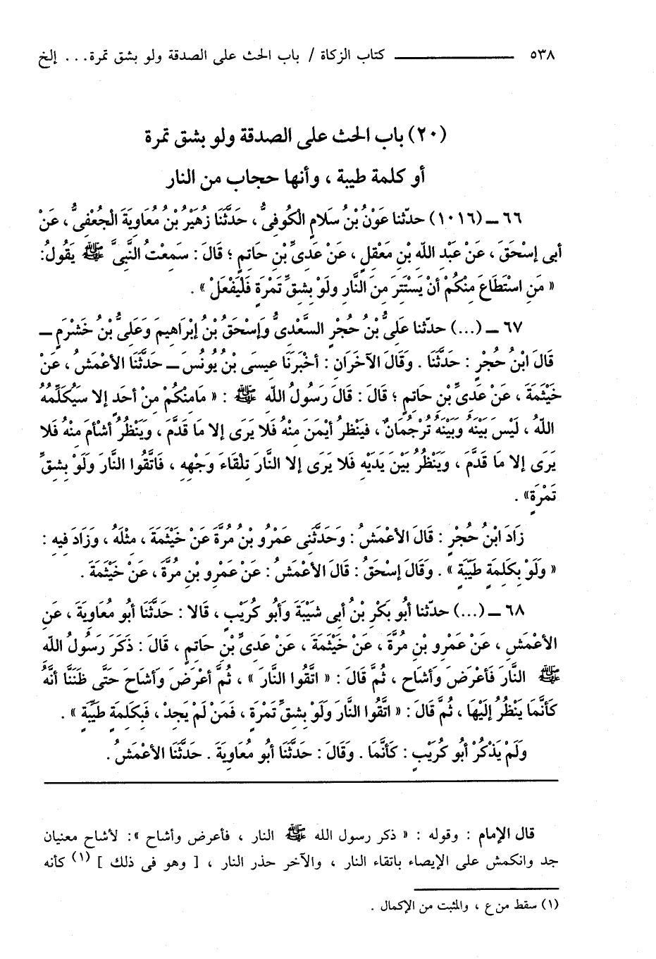 68 - (...) حدّثنا أَبُو بَكْرِ بْنُ أَبِى شَيْبَةَ وَأَبُو كَرَيْبٍ، قَالا: حَدَّثَنَا أَبُو مُعَاوِيَةَ، عَنِ الأَعْمَشِ، عَنْ عَمْرِو بْنِ مُرَّةَ، عَنْ خَيْثَمَةَ، عَنْ عَدِىٍّ بْنِ حَاتِمٍ، قَالَ: ذَكَرَ رَسُولُ اللهِ صَلَّى اللهُ عَلَيْهِ وَسَلَّمَ النَّارَ فَأعْرَضَ وَأشَاح، ثُمَّ قَالَ: " اتَّقُوا النَّارَ "، ثُمَّ أعْرَضَ وَأشَاحَ حَتَّى ظَنَنَّا أَنَّهُ كَأنَّمَا يَنْظُرُ إلَيْهَا، ثُمَّ قَالَ: " اتَّقُوا النَّارَ وَلَوْ بِشِقِّ تَمْرَةٍ، فَمَنْ لَمْ يَجِدْ، فَبِكَلِمَةٍ طَيِّبَةٍ ". وَلَمْ يَذْكُرْ أَبُو كُرَيْبٍ: كَأنَّمَا. وَقَالَ: حَدَّثَنَا أَبُو مُعَاوِيَةَ. حَدَّثَنَا الأَعْمَشُ.