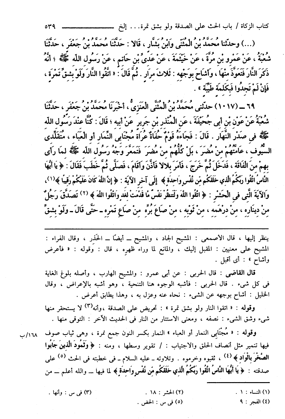 (...) وحدّثنا مُحَمَّدُ بْنُ الْمُثَنَّى وَابْنُ بَشَّارٍ، قَالا: حَدَّثَنَا مُحَمَّدُ بْنُ جَعْفَرٍ، حَدَّثَنَا شُعْبَةُ، عَن عَمْرِو بْنِ مُرَّةَ، عَنْ خَيْثَمَةَ، عَنْ عَدِىِّ بْنِ حَاتِمٍ، عَنْ رَسُولِ اللهِ صَلَّى اللهُ عَلَيْهِ وَسَلَّمَ؛ أَنَّهُ ذَكَرَ النَّارَ فَتَعَوَّذَ مِنْهَا، وَأشَاحَ بِوَجْهِهِ: ثَلاثَ مِرَارٍ. ثُمَّ قَالَ: " اتَّقُوا النَّارَ وَلَوْ بِشِقِّ تَمْرَةٍ، فَإنْ لَمْ تَجِدُوا فَبِكَلِمَةٍ طَيِّبَةٍ ".