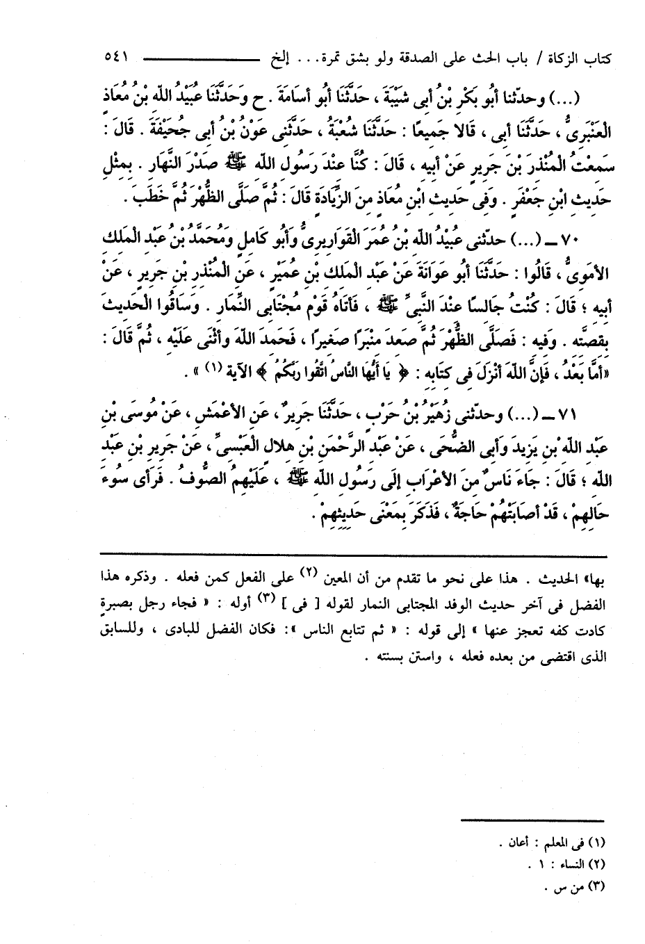 70 - (...) حدّثنى عُبيْدُ اللهِ بْنُ عُمَرَ الْقَوَارِيرِىُّ وَأَبُو كَامِلِ وَمُحَمَّدُ بْنُ عَبْدِ الْمَلِكِ الأُمَوِىُّ، قَالُوا: حَدَّثَنَا أَبُو عَوَانَةَ عَنْ عَبْدِ الْمَلِكِ بْنِ عُمَيْرٍ، عَنِ الْمُنْذِرِ بْنِ جَرِيرٍ، عَنْ أَبِيهِ؛ قَالَ: كُنْتُ جَالِسًا عِنْدَ النَّبِىِّ صَلَّى اللهُ عَلَيْهِ وَسَلَّمَ، فَأَتَاَهُ قَوْم مُجْتَابِى النِّمَارِ. وَسَاقُوا الْحَدِيثَ بِقِصَّتِهِ. وَفِيهِ: فَصَلَّى الظُّهْرَ ثُمَّ صَعِدَ مِنْبَرًا صَغِيرًا، فَحَمِدَ اللهَ وَأَثْنَى عَلَيْهِ، ثُمَّ قَالَ: " أَمَّا بَعْدُ، فَإِنَّ اللهَ أَنْزَلَ فِى كِتَابِهِ: {يَا أَيُّهَا النَّاسُ اتَّقُوا رَبَّكُمُ} الآية (¬1) ".