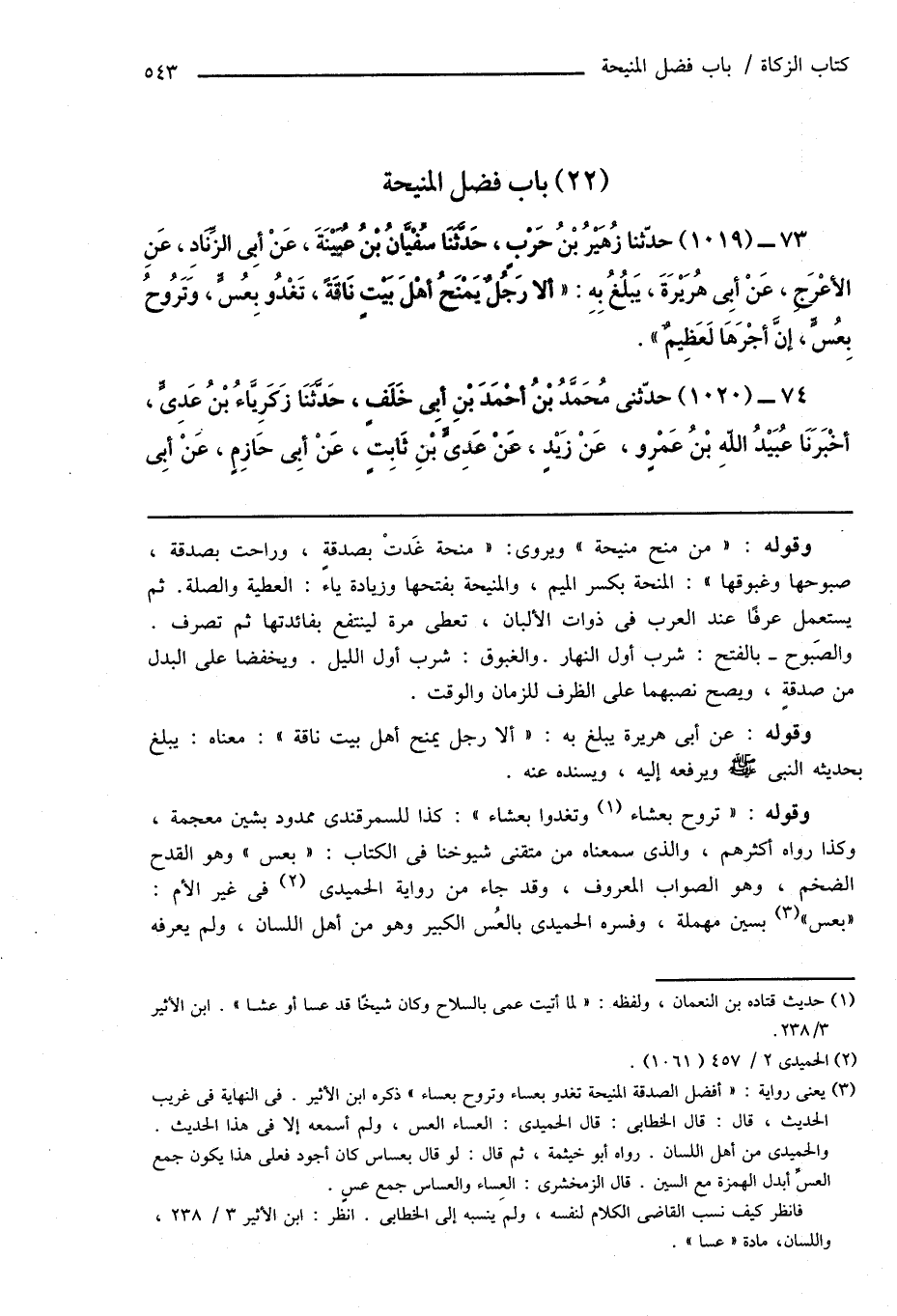 73 - (1019) حدّثنا زُهَيْرُ بْنُ حَرْبٍ، حَدَّثَنَا سُفْيَانُ بْنُ عُيَيْنَةَ، عَنْ أَبِى الزِّنَادِ، عَنِ الأَعْرَجِ، عَنْ أَبِى هُرَيْرَةَ، يَبلُغُ بِهِ: " ألا رَجُلٌ يَمْنَحُ أَهْلَ بَيْتٍ نَاقَةً، تَغْدُو بِعُسٍّ، وَتَرُوحُ بِعُسٍّ، إِنَّ أجْرَهَا لَعَظِيمٌ ".