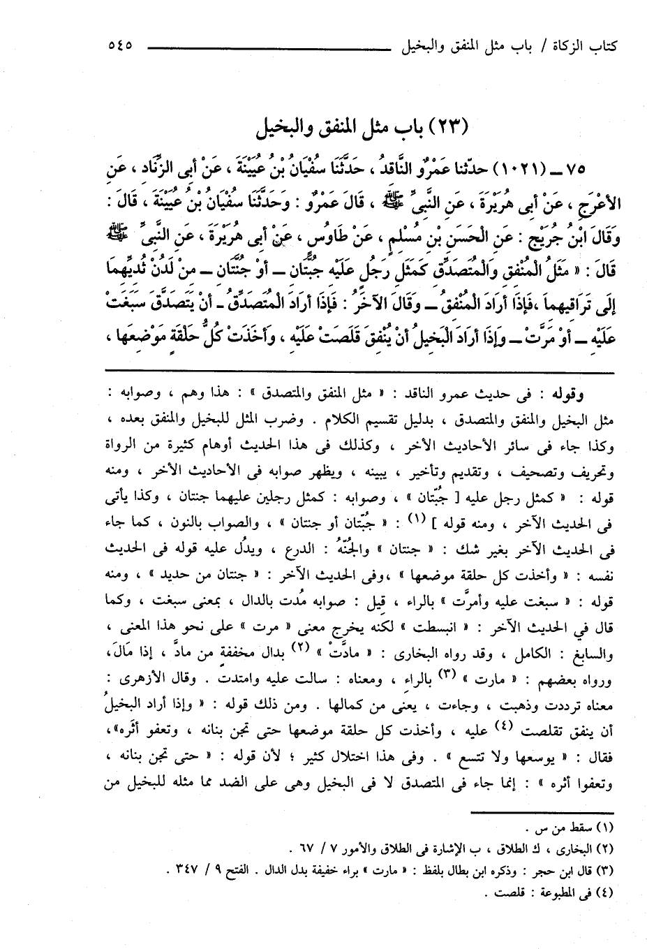 75 - (1021) حدّثنا عَمْرٌو النَّاقِدُ، حَدَّثَنَا سُفْيَانُ بْنُ عُيَيْنَةَ، عَنْ أَبِى الزِّنَادِ، عَنِ الأَعْرَجِ، عَنْ أَبِى هُرَيْرَةَ، عَنِ النَّبِىِّ صَلَّى اللهُ عَلَيْهِ وَسَلَّمَ، قَالَ عَمْرٌو: وَحَدَّثَنَا سُفْيَانُ بْنُ عُيَيْنَةَ، قَالَ: وَقَالَ ابْنُ جُرَيْجٍ: عَنِ الْحَسَنِ بْنِ مُسْلِمٍ، عَنْ طَاوُسٍ، عَنْ أَبِى هُرَيْرَةَ، عَنِ النَّبِىِّ صَلَّى اللهُ عَلَيْهِ وَسَلَّمَ قَالَ: " مَثَلُ الْمُنْفِقِ وَالْمُتَصَدِّقِ كَمَثَلِ رَجُلٍ عَلَيْهِ جُبَّتَانِ - أَوْ جُنَّتَانِ - مِنْ لَدُنْ ثُدِيِّهِمَا إِلَى تَرَاقِيهمِا، فَإِذَا أَرَادَ الْمُنْفِقُ - وَقَالَ الآخَرُ: فَإذَا أَرَادَ الْمُتَصَدِّقُ - أَنْ يَتَصَدَّقَ سَبَغَتْ عَلَيْهِ - أَوْ مَرَّتْ - وَإِذَا أَرَادَ الْبَخِيلُ أَنْ يُنْفِقَ قَلَصَتْ عَلَيْهِ، وَأخَذَتْ كُلُّ حَلْقَةٍ مَوْضِعَها،