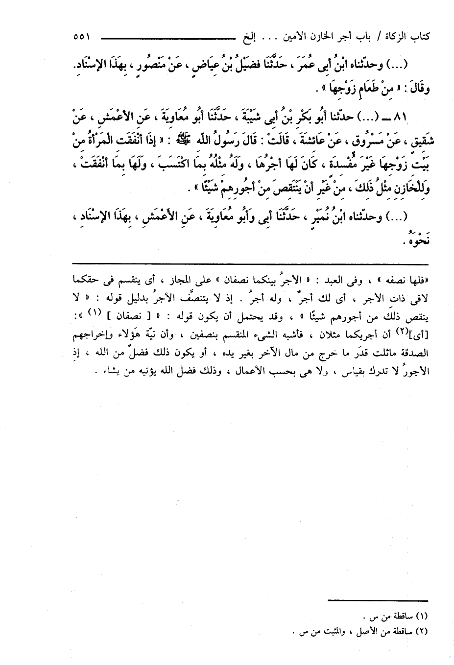 81 - (...) حدّثنا أَبُو بَكْرِ بْنُ أَبِى شَيْبَةَ، حَدَّثَنَا أَبُو مُعَاوِيَةَ، عَنِ الأَعْمَشِ، عَنْ شَقِيقٍ، عَنْ مَسْرُوقٍ، عَنْ عَائِشَةَ، قَالَتْ: قَالَ رَسُولُ اللهِ صَلَّى اللهُ عَلَيْهِ وَسَلَّمَ: " إِذَا أنْفَقَتِ الْمَرْأَةُ مِنْ بَيْتِ زَوْجِهَا غَيْرَ مُفْسِدَةٍ، كَانَ لَهَا أجْرُهَا، وَلَهُ مِثْلُهُ بِمَا اكْتَسَبَ، وَلَهَا بِمَا أنْفَقَتْ، وَلِلْخَازِنِ مِثْلُ ذَلِكَ، مِنْ غَيْرِ أَنْ يَنْتَقِصَ مِنْ أجُورِهِمْ شَيْئًا ".