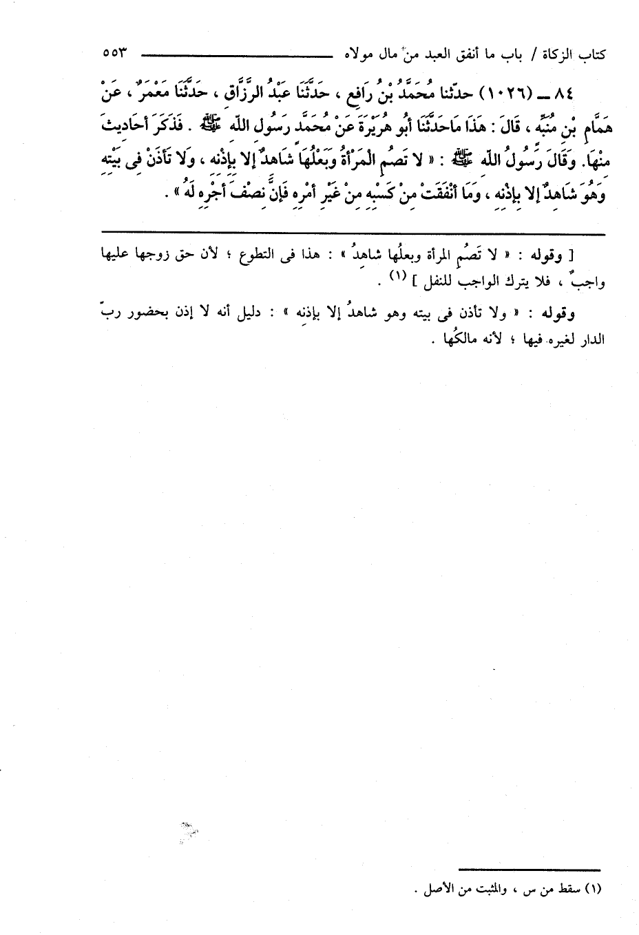 84 - (1026) حدّثنا مُحَمَّدُ بْنُ رَافِع، حَدَّثَنَا عَبْدُ الرَّزَّاقِ، حَدَّثَنَا مَعْمَرٌ، عَنْ هَمَّامِ بْنِ مُنَبِّهٍ، قَالَ: هَذَا مَا حَدَّثَنَا أَبُو هُرَيْرَةَ عَنْ مُحَمَّدٍ رَسُولِ اللهِ صَلَّى اللهُ عَلَيْهِ وَسَلَّمَ. فَذَكَرَ أَحَادِيثَ مِنْهَا. وَقَالَ رَسُولُ اللهِ صَلَّى اللهُ عَلَيْهِ وَسَلَّمَ: " لا تَصُمِ الْمَرْأَةُ وَبَعْلُهَا شَاهِدٌ إلا بِإِذْنِهِ، وَلا تَأذَنْ فِى بَيْتِهِ وَهُوَ شَاهِدٌ إلا بِإذْنِهِ، وَمَا أنْفَقَتْ مِنْ كَسْبِهِ مِن غَيْرِ أمْرِهِ فَإِنَّ نِصْفَ أجْرِهِ لَهُ ".