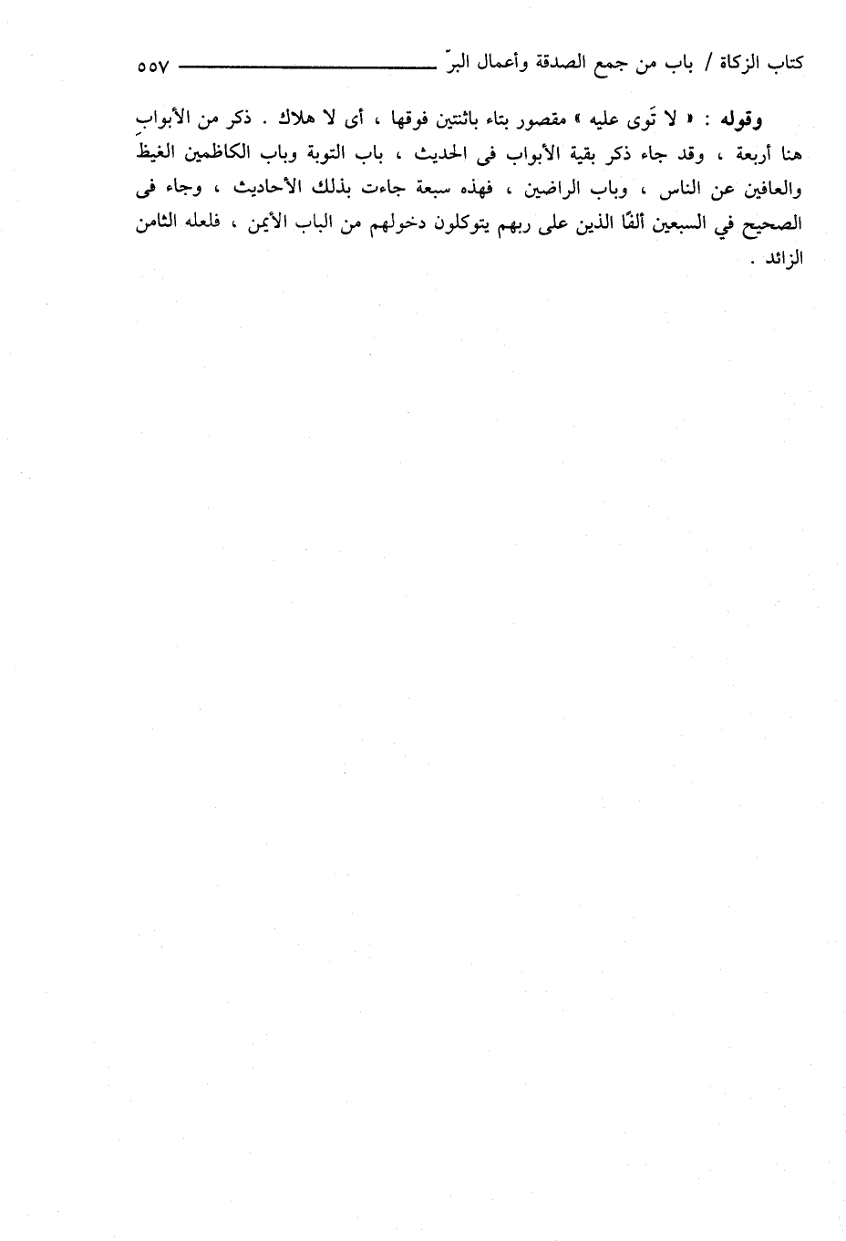 وقوله: " لا تَوى عليه " مقصور بتاء باثنتين فوقها، أى لا هلاك. ذكر من الأبوابِ هنا أربعة، وقد جاء ذكر بقية الأبواب فى الحديث، باب التوبة وباب الكاظمين الغيظ والعافين عن الناس، وباب الراضين، فهذه سبعة جاءت بذلك الأحاديث، وجاء فى الصحيح في السبعين ألفًا الذين على ربهم يتوكلون دخولهم من الباب الأيمن، فلعله الثامن الزائد.