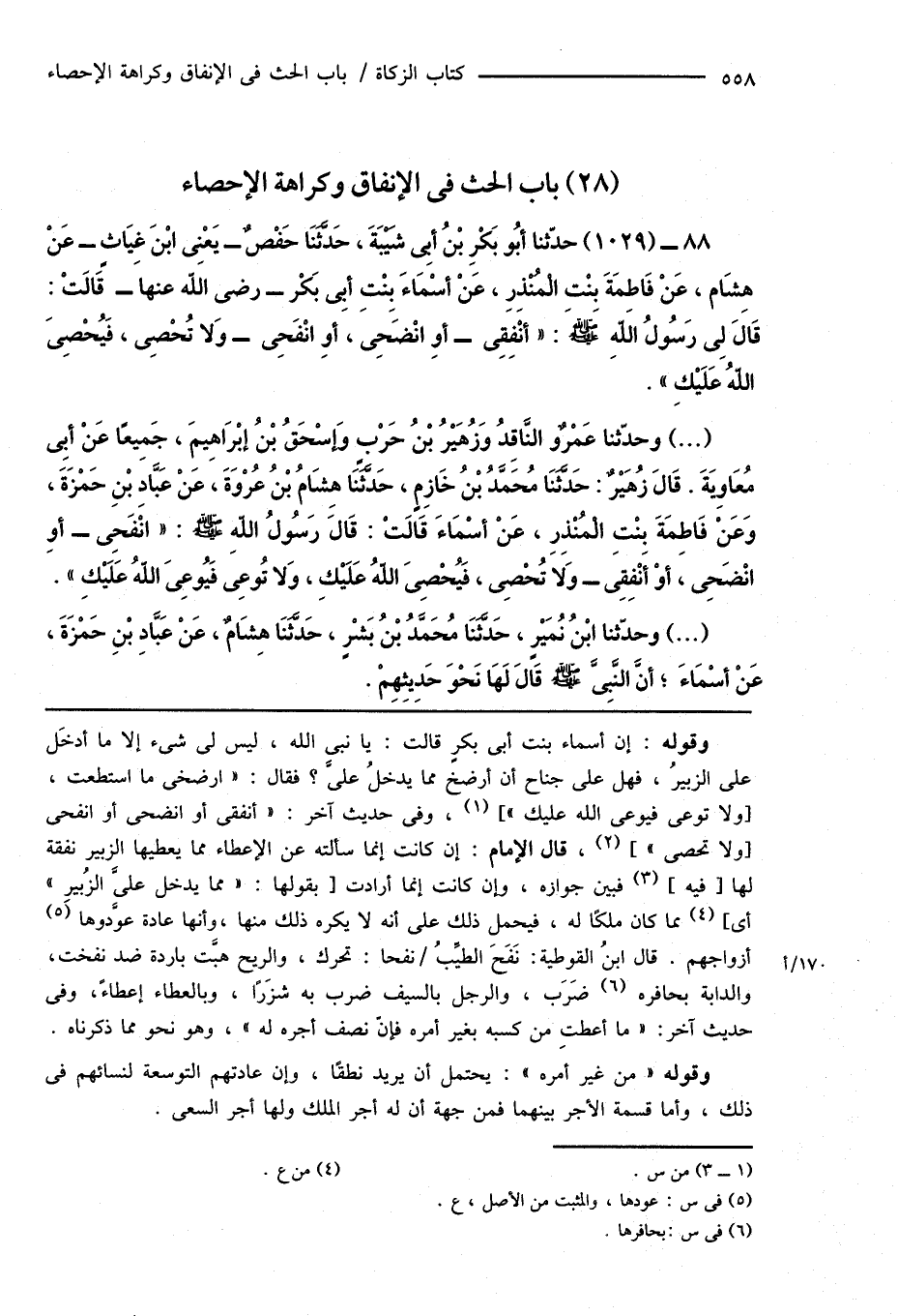 88 - (1029) حدّثنا أَبُو بَكْرِ بْنُ أَبِى شَيْبَةَ، حَدَّثَنَا حَفْصٌ - يَعْنِى ابْنَ غِيَاثٍ - عَنْ هِشَام، عَنْ فَاطِمَةَ بِنْتِ الْمُنْذِرِ، عَنْ أَسْمَاءَ بِنْتِ أَبِى بَكْر - رضى الله عنها - قَالَتْ: قَالَ لِى رَسُولُ اللهِ صَلَّى اللهُ عَلَيْهِ وَسَلَّمَ: " أنْفِقِى - أَوِ انْضَحِى، أَوِ انْفَحِى - وَلا تُحْصِى، فَيُحْصِىَ اللهُ عَلَيْكِ ".