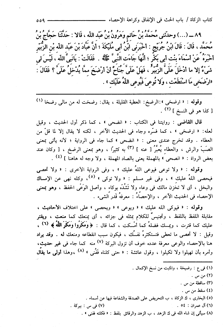 89 - (...) وحدَّثنى مُحَمَّدُ بْنُ حَاتِمٍ وَهَارُونُ بْنُ عَبْدِ اللهِ، قَالا: حَدَّثَنَا حَجَّاجُ بْنُ مُحَمَّدٍ، قَالَ: قَالَ ابْنُ جُرَيْجٍ: أَخْبَرَنِى ابْنُ أَبِى مُلَيْكَةَ؛ أَنَّ عَبَّادَ بْنَ عَبْدِ اللهِ بْنِ الزُّبَيْرِ أَخْبَرَهُ عَنْ أَسْمَاءَ بِنْتِ أَبِى بَكْرٍ؛ أَنَّهَا جَاءَتِ النَّبِىَّ صَلَّى اللهُ عَلَيْهِ وَسَلَّمَ. فَقَالَتْ: يَا نَبِىَّ اللهِ، لَيْسَ لِى شَىْءٌ إلا ما أَدْخَلَ عَلَىَّ الزُّبَيْرُ، فَهَلْ عَلَىَّ جُنَاحٌ أَنْ أرْضَخَ مِمَّا يُدْخِلُ عَلَىَّ؟ فَقَالَ: " ارْضَخِى مَا اسْتَطَعْتِ، وَلا تُوعِىَ فَيُوعِى اللهُ عَلَيْكِ ".