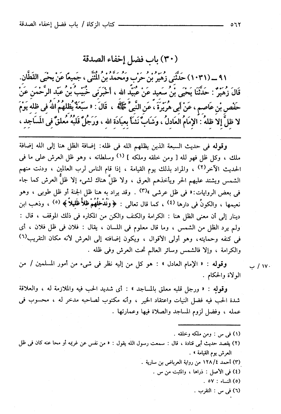 91 - (1031) حَدَّثَنِى زُهَيْرُ بْنُ حَرْبٍ وَمُحَمَّدُ بْنُ الْمُثَنَّى، جَمِيعًا عَنْ يَحْيَى القَطَّانِ. قَالَ زُهَيْرٌ: حَدَّثَنَا يَحْيَى بْنُ سَعِيدٍ عَنْ عُبَيْدِ اللهِ، أَخْبَرَنِى خُبَيْبُ بْنُ عَبْدِ الرَّحْمَنِ عَنْ حَفْصِ بْنِ عَاصِمٍ، عَنْ أَبِى هُرَيْرَةَ، عَنِ النَّبِىِّ صَلَّى اللهُ عَلَيْهِ وَسَلَّمَ، قَالَ: " سَبْعَةٌ يُظِلهُمُ اللهُ فِى ظِلهِ يَوْمَ لا ظِلَّ إِلا ظِلهُ: الإِمَامُ العَادِلُ، وَشَابٌ نَشَأَ بِعِبَادَةِ اللهِ، وَرَجُلٌ قَلْبُهُ مُعلقٌ فِى المَسَاجِدِ،