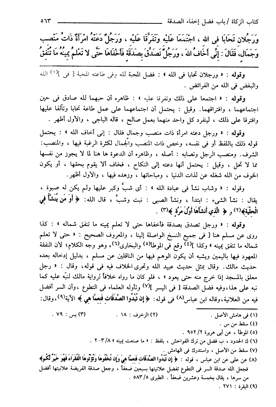 وقوله: " ورجل تصدق بصدقة فأخفاها حتى لا تعلم يمينه ما تنفق شماله ": كذا روى عن مسلم هنا [فى جميع النسخ الواصلة إلينا، والمعروف الصحيح: " حتى لا تعلم شماله ما تنفق يمينه " وكذا] (¬4) وقع فى الموطأ (¬5) والبخارى (¬6)، وهو وجه الكلام؛ لأن النفقة المعهود فيها باليمين ويشبه أن يكون الوهم فيها من الناقلين عن مسلم، بدليل إدخاله بعده حديث مالك. وقال بمثل حديث عبيد الله وتحرى الخلاف فيه فى قوله، وقال: " رجل معلق بالمسجد إذا خرج منه حتى يعود "، فلو كان ما رواه خلافاً لرواية مالك لنبّه عليه كما نبه على هذا، وفيه فضل الصدقة [فى اليسر] (¬7) وتأوله العلماء فى التطوع، وأن السر أفضل فيه من العلانية، وقاله ابن عباس (¬8) فى قوله: {إِن تُبْدُوا الصَّدَقَاتِ فَنِعِمَّا هِي} الآية (¬9)، وقال: