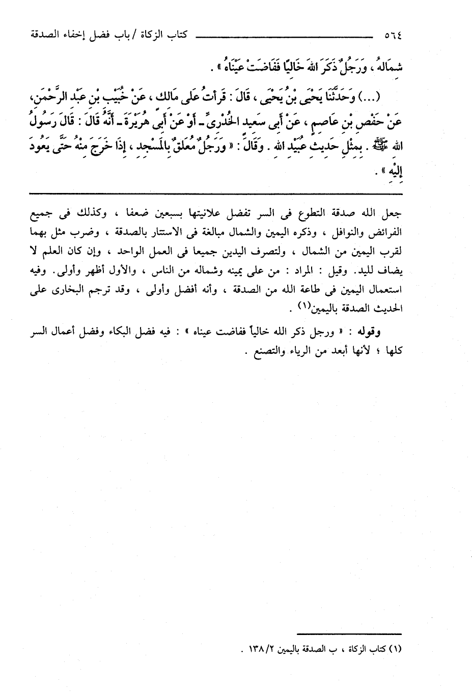 (¬1) كتاب الزكاة، ب الصدقة باليمين 2/ 138.
