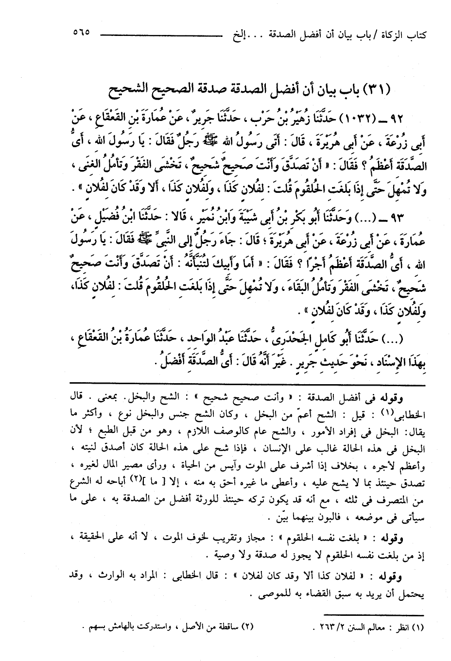 92 - (1032) حَدَّثَنَا زُهَيْرُ بْنُ حَرْبٍ، حَدَّثَنَا جَرِيرٌ، عَنْ عُمَارَةَ بْنِ القَعْقَاعِ، عَنْ أَبِى زُرْعَةَ، عَنْ أَبِى هُرَيْرَةَ، قَالَ: أَتَى رَسُولُ اللهِ صَلَّى اللهُ عَلَيْهِ وَسَلَّمَ رَجُلٌ فَقَالَ: يَا رَسُولَ اللهِ، أَىُّ الصَّدَقَةِ أَعْظَمُ؟ فَقَالَ: " أَنْ تَصَدَّقَ وَأَنْتَ صَحِيحٌ شَحِيحٌ، تَخْشَى الفَقْرَ وَتأمُلُ الغِنَى، وَلا تُمْهِلَ حَتَّى إِذَا بَلغَتِ الحُلقُومَ قُلْتَ: لِفُلانٍ كَذَا، وَلِفُلانٍ كَذَا، أَلا وَقَدْ كَانَ لِفُلانٍ ".