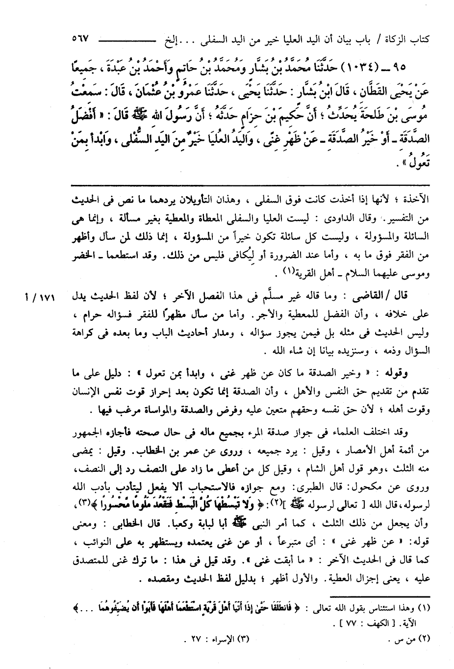 95 - (1034) حَدَّثَنَا مُحَمَّدُ بْنُ بَشَّارٍ وَمحَمَّدُ بْنُ حَاتِمٍ وَأَحْمَدُ بْنُ عَبْدَةَ، جَمِيعًا عَنْ يَحْيَى القَطَّانِ، قَالَ ابْنُ بَشَّارٍ: حَدَّثَنَا يَحْيَى، حَدَّثَنَا عَمْرُو بْنُ عُثْمَانَ، قَالَ: سَمِعْتُ مُوسَى بْنَ طَلْحَةَ يُحَدِّثُ؛ أَنَّ حَكِيمَ بْنَ حِزَامٍ حَدَّثَهُ؛ أَنَّ رَسُولَ اللهِ صَلَّى اللهُ عَلَيْهِ وَسَلَّمَ قَالَ: " أَفْضَلُ الصَّدَقَةِ - أَوْ خَيْرُ الصَّدَقَةِ - عَنْ ظَهْرِ غِنًى، وَاليَدُ العُليَا خَيْرٌ مِنَ اليَدِ السُّفْلى، وَابْدأ بِمَنْ تَعُولُ ".