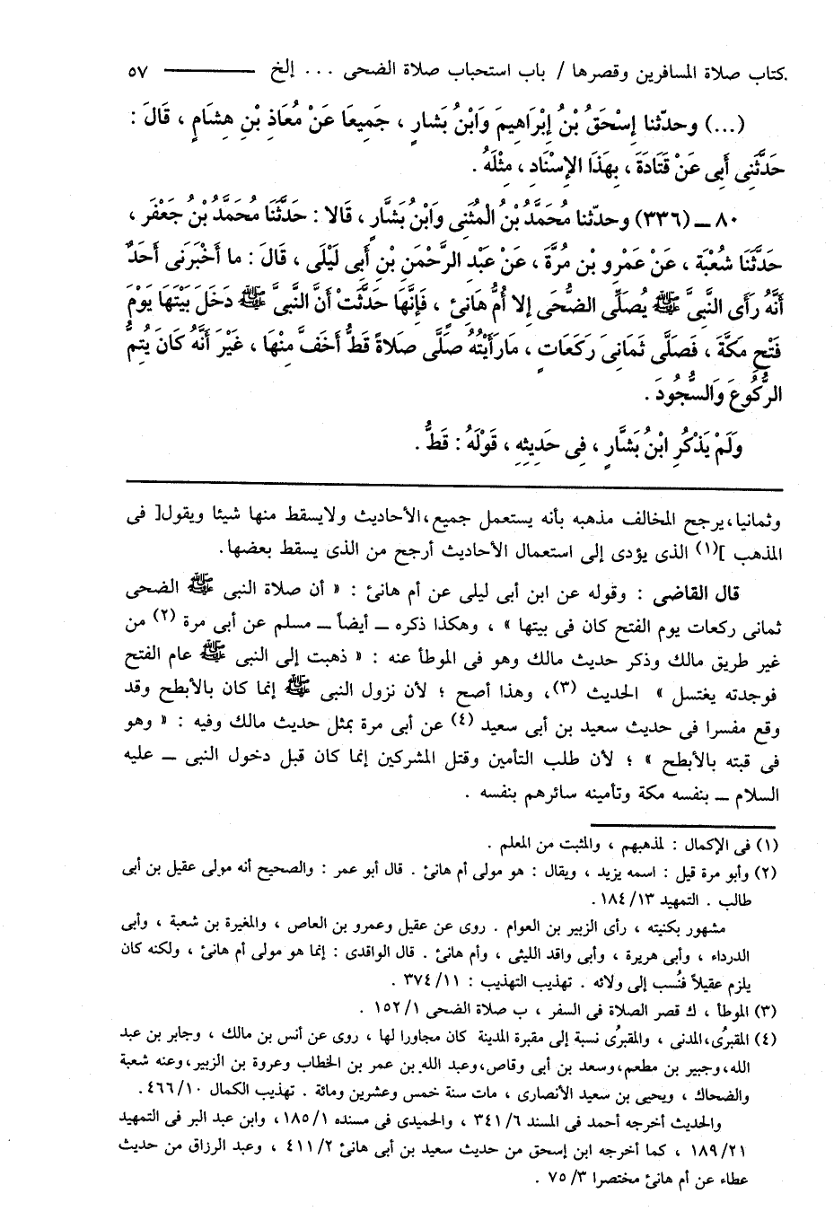 80 - (336) وحدّثنا مُحَمَّدُ بْنُ الْمُثَنَّى وَابْنُ بَشَّارٍ، قَالا: حَدَّثَنَا مُحَمَّدُ بْنُ جَعْفَرٍ، حَدَّثَنَا شُعْبَة، عَنْ عَمْرِو بْن مُرَّةَ، عَنْ عَبْدِ الرَّحْمَنِ بْنِ أَبِى لَيْلَى، قَالَ: مَا أَخْبَرَنِى أَحَدٌ أَنَّهُ رَأَى النَّبِىَّ صَلَّى اللهُ عَلَيْهِ وَسَلَّمَ يُصَلِّى الضُّحَى إِلا أُمُّ هَانِئٍ، فَإِنَّهَا حَدَّثَتْ أَنَّ النَّبِىَّ صَلَّى اللهُ عَلَيْهِ وَسَلَّمَ دَخَلَ بَيْتَهَا يَوْمَ فَتْحِ مَكَّةَ، فَصَلَّى ثَمَانِىَ رَكَعَاتٍ، مَا رَأَيْتُهُ صَلَّى صَلاةً قَطُّ أَخَفَّ مِنْهَا، غَيْرَ أَنَّهُ كَانَ يُتِمُّ الرُّكُوعَ وَالسُّجُودَ.