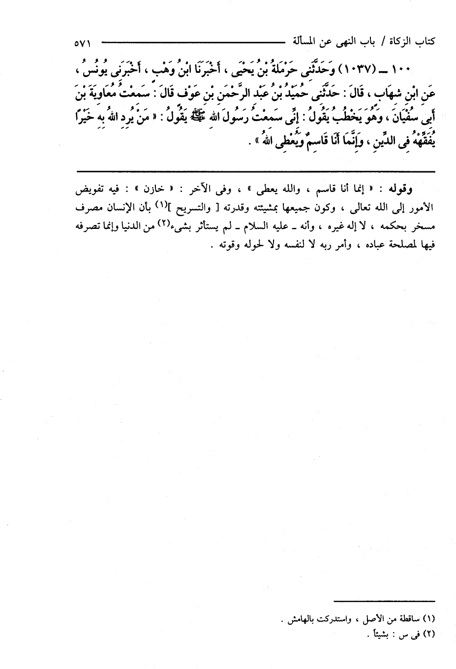 100 - (1037) وَحَدَّثَنِى حَرْمَلةُ بْنُ يَحْيَى، أَخْبَرَنَا ابْنُ وَهْبٍ، أَخْبَرَنِى يُونُسُ، عَنِ ابْنِ شِهَابٍ، قَالَ: حَدَّثَنِى حُمَيْدُ بْنُ عَبْدِ الرَّحْمَنِ بْنِ عَوْفٍ قَالَ: سَمِعْتُ مُعَاوِيَةَ بْنَ أَبِى سُفْيَانَ، وَهُوَ يَخْطُبُ يَقُولُ: إِنِّى سَمِعْتُ رَسُولَ اللهِ صَلَّى اللهُ عَلَيْهِ وَسَلَّمَ يَقُولُ: " مَنْ يُرِدِ اللهُ بِهِ خَيْرًا يُفَقِّهْهُ فِى الدِّينِ، وَإِنَّمَا أَنَا قَاسِمٌ وَيُعْطِى اللهُ ".