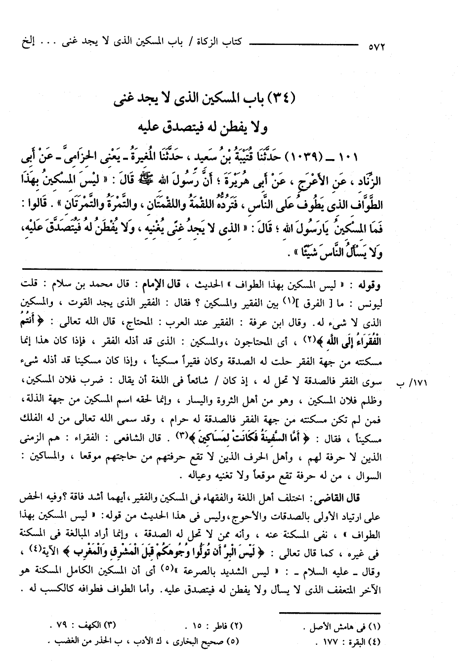 101 - (1039) حَدَّثَنَا قُتَيْبَةُ بْنُ سَعِيدٍ، حَدَّثَنَا المُغِيرَةُ - يَعْنِى الحِزَامِىَّ - عَنْ أَبِى الزِّنَادِ، عَنِ الأَعْرَجِ، عَنْ أَبِى هُرَيْرَةَ؛ أَنَّ رَسُولَ اللهِ صَلَّى اللهُ عَلَيْهِ وَسَلَّمَ قَالَ: " ليْسَ المِسْكِينُ بِهَذَا الطَّوَّافِ الذِى يَطُوفُ عَلى النَّاسِ، فَتَرُدُّهُ اللقْمَةُ واللقْمَتَانِ، والتَّمْرَةُ والتَّمْرَتَانِ ". قَالوا: فَمَا المِسْكِينُ يَا رَسُولَ اللهِ؛ قَالَ: " الذِى لا يَجِدُ غِنًى يُغْنِيهِ، وَلا يُفْطَنُ لَهُ فَيُتَصَدَّقَ عَليْهِ، وَلا يَسْأَلُ النَّاسَ شَيْئًا ".