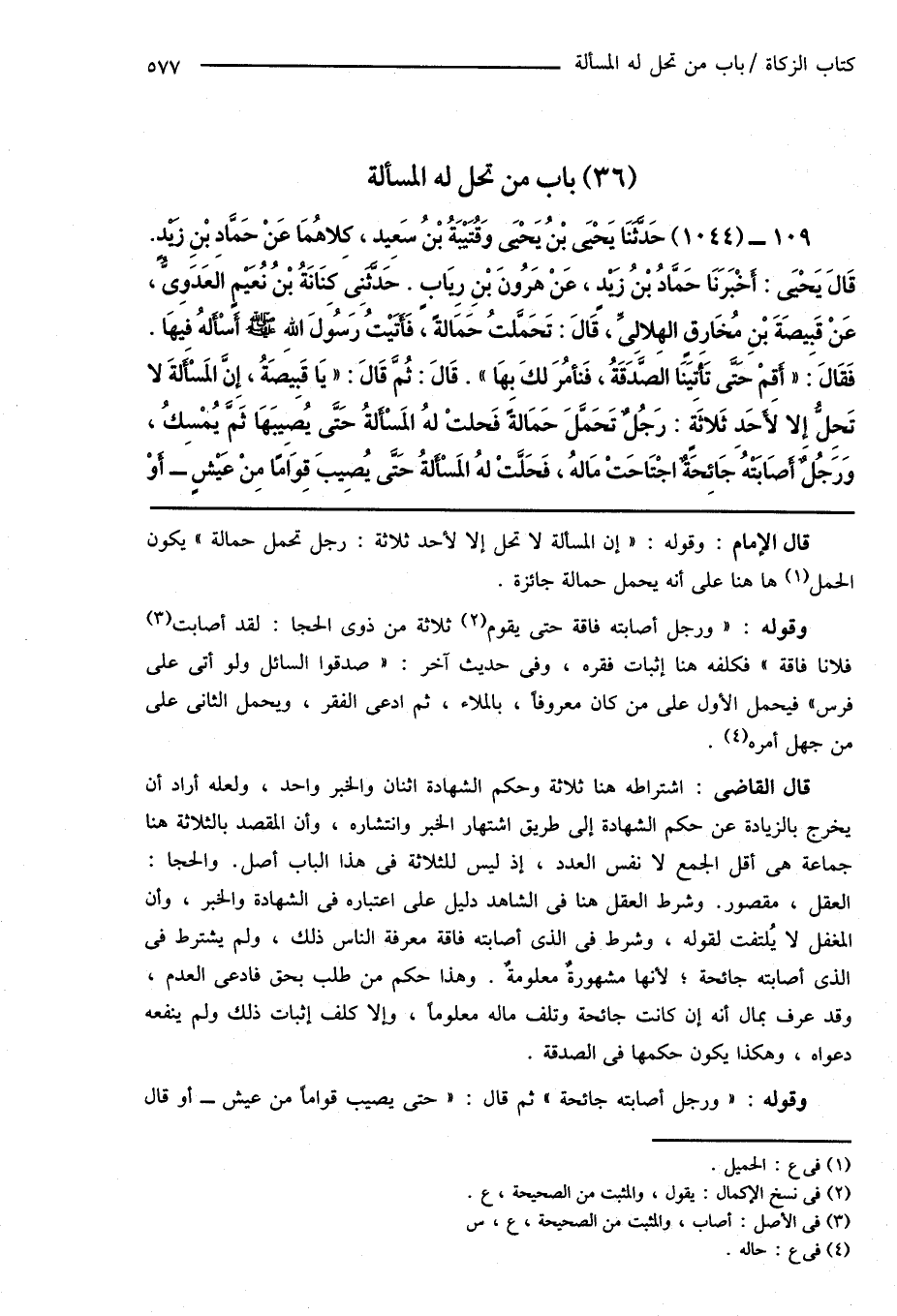 109 - (1044) حَدَّثَنَا يَحْيَى بْنُ يَحْيَى وَقُتَيْبَةُ بْنُ سَعِيدٍ، كِلاهُمَا عَنْ حَمَّادِ بْنِ زَيْدٍ. قَالَ يَحْيَى: أَخْبَرَنَا حَمَّادُ بْنُ زَيْدٍ، عَنْ هَارُونَ بْنِ رِيَابٍ. حَدَّثَنِى كِنَانَةُ بْنُ نُعَيْمٍ العَدَوِىُّ، عَنْ قَبِيصَةَ بْنِ مُخَارِقٍ الهِلالِىِّ، قَالَ: تَحَمَّلتُ حَمَالةً، فَأَتَيْتُ رَسُولَ اللهِ صَلَّى اللهُ عَلَيْهِ وَسَلَّمَ أَسْأَلهُ فِيهَا. فَقَالَ: " أَقِمْ حَتَّى تَأَتِيَنَا الصَّدَقَةُ، فَنأمُرَ لكَ بِهَا ". قَالَ: ثُمَّ قَالَ: " يَا قَبِيصَةُ، إِنَّ المَسْأَلةَ لا تَحِلُّ إِلا لأَحَدِ ثَلاثَةٍ: رَجُلٌ تَحَمَّلَ حَمَالةً فَحلتْ لَهُ المَسْأَلةُ حَتَّى يُصِيبَهَا ثَمَّ يُمْسِكُ، وَرَجُلٌ أَصَابَتْهُ جَائِحَةٌ اجْتَاحَتْ مَالهُ، فَحَلَّتْ لَهُ المَسْأَلةُ حَتَّى يُصِيبَ قِوَامًا مِنْ عَيْشٍ - أَوْ