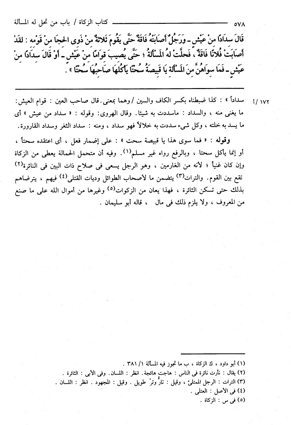سداداً ": كذا ضبطناه بكسر الكاف والسين وهما بمعنى. قال صاحب العين: قوام العيش: ما يغنى منه، والسداد: ما سددت به شيئاً. وقال الهروى: وقوله: " سداد من عيش " أى ما يسد به خلته، وكل شىء سددت به خلالاً فهو سداد، ومنه: سداد الثغر وسداد القارورة. وقوله: " فما سوى هذا يا قبيصة سحت ": على إضمار فعل، أى اعتقده سحتاً، أو إنما يأكل سحتاً، وبالرفع رواه غير مسلم (¬1). وفيه أن متحمل الحمالة يعطى من الزكاة وإن كان غنياً؛ لأنه من الغارمين، وهو الرجل يسعى فى صلاح ذات البين فى النائرة (¬2) تقع بين القوم. والترات (¬3) يتضمن ما لأصحاب الطوائل وديات القتلى (¬4) فيهم، يترضاهم بذلك حتى تسكن الثائرة، فهذا يعان من الزكوات (¬5) وغيرها من أموال الله على ما صنع من المعروف، ولا يلزم ذلك فى مال، قاله أبو سليمان.