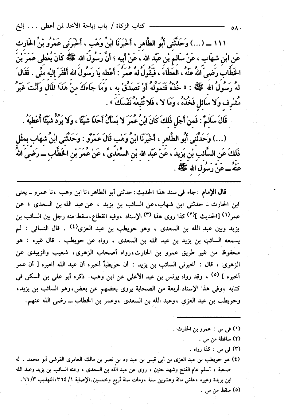 111 - (...) وَحَدَّثَنِى أَبُو الطَّاهِرِ، أَخْبَرَنَا ابْنُ وَهْبٍ، أَخْبَرَنِى عَمْرُو بْنُ الْحَارِثِ عَنِ ابْنِ شِهَابٍ، عَنْ سَالِمِ بْنِ عبدِ اللهِ، عَنْ أَبِيهِ؛ أَنَّ رَسُولَ اللهِ صَلَّى اللهُ عَلَيْهِ وَسَلَّمَ كَانَ يُعْطِى عَمَرَ بْنَ الخَطَّابِ رَضِىَ اللهُ عَنْهُ، العَطَاءَ، فَيَقُولُ لَهُ عُمَرُ: أَعْطِهِ يَا رَسُول اللهِ أَفْقَرَ إِليْهِ مِنِّى. فَقَالَ لَهُ رَسُولُ اللهِ صَلَّى اللهُ عَلَيْهِ وَسَلَّمَ: " خُذْهُ فَتَمَوَّلهُ أَوْ تَصَدَّقْ بِهِ، وَمَا جَاءَكَ مِنْ هَذَا المَالِ وَأَنْتَ غَيْرُ مُشْرِفٍ وَلا سَائِلٍ فَخُذْهُ، وَمَا لا، فَلا تُتْبِعْهُ نَفْسَكَ ".