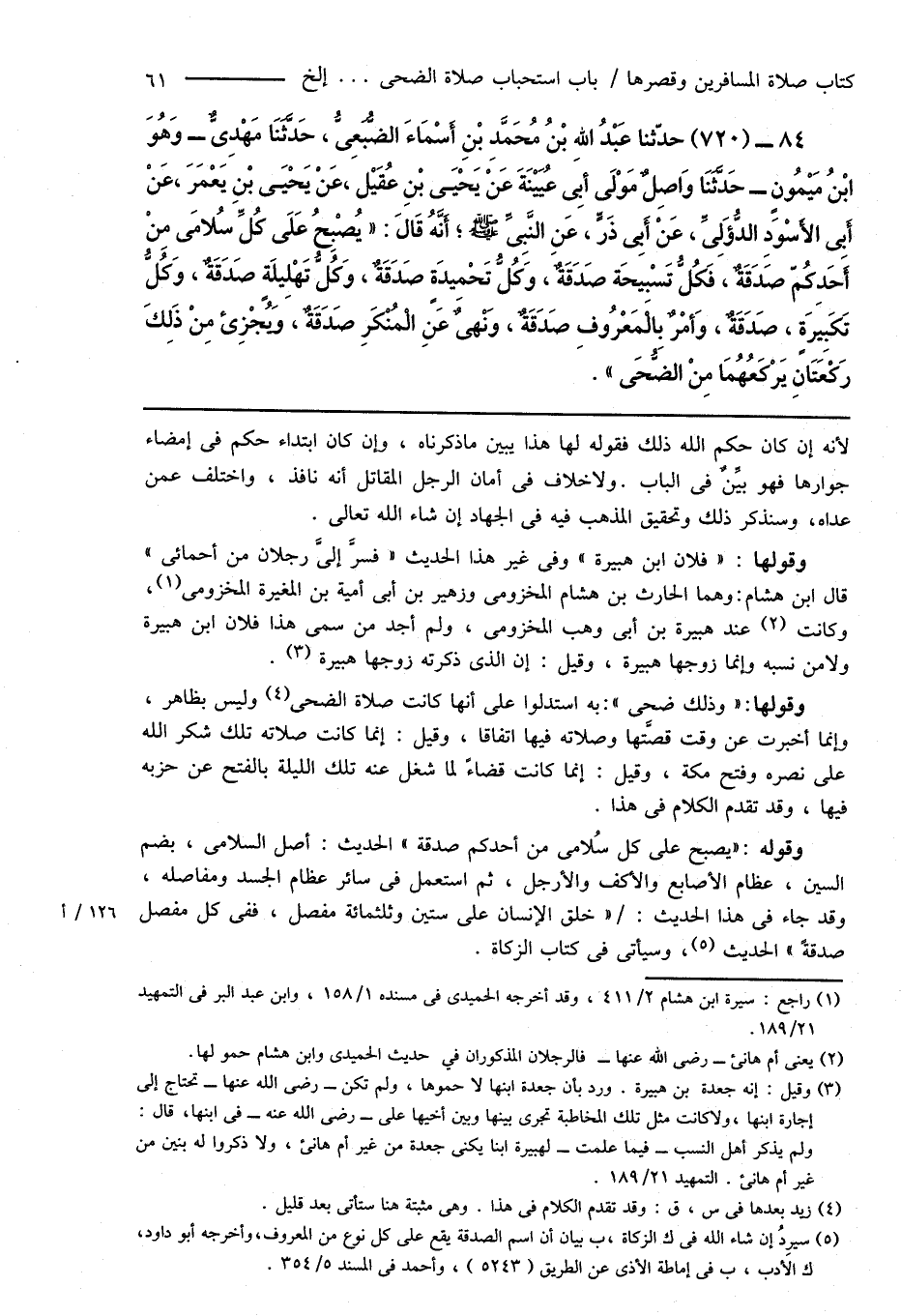 84 - (720) حدّثنا عَبْدُ اللهِ بْنُ مُحَمَّدِ بْنِ أَسْمَاءَ الضُّبَعِىُّ، حَدَّثَنَا مَهْدِىٌّ - وَهُوَ ابْنُ مَيْمُونٍ - حَدَّثَنَا وَاصِلٌ مَوْلَى أَبِى عُيَيْنَةَ عَنْ يَحْيَى بْنِ عُقَيْلٍ، عَنْ يَحْيَى بْنِ يَعْمَرَ، عَنْ أَبِى الأَسْوَدِ الدُّؤَلِىِّ، عَنْ أَبِى ذَرٍّ، عَنِ النَّبِىِّ صَلَّى اللهُ عَلَيْهِ وَسَلَّمَ؛ أَنَّهُ قَالَ: " يُصْبِحُ عَلَى كُلِّ سُلامَى مِنْ أَحَدِكُم صَدَقَةٌ، فَكُلُّ تَسْبِيحَةٍ صَدَقَةٌ، وَكُلُّ تَحْمِيدَةٍ صَدَقَةٌ، وَكُلُّ تَهْلِيلَةٍ صَدَقَةٌ، وَكُلُّ تَكَبِيَرَةٍ صَدَقَةٌ، وَأَمْرٌ بِالْمَعْرُوفِ صَدَقَةٌ، وَنْهىٌ عَنِ الْمُنْكَرِ صَدَقَةٌ، وُيجْزِئ مِنْ ذَلِكَ رَكْعَتَانِ يَرْكَعُهُمَا مِنْ الضُّحَى ".