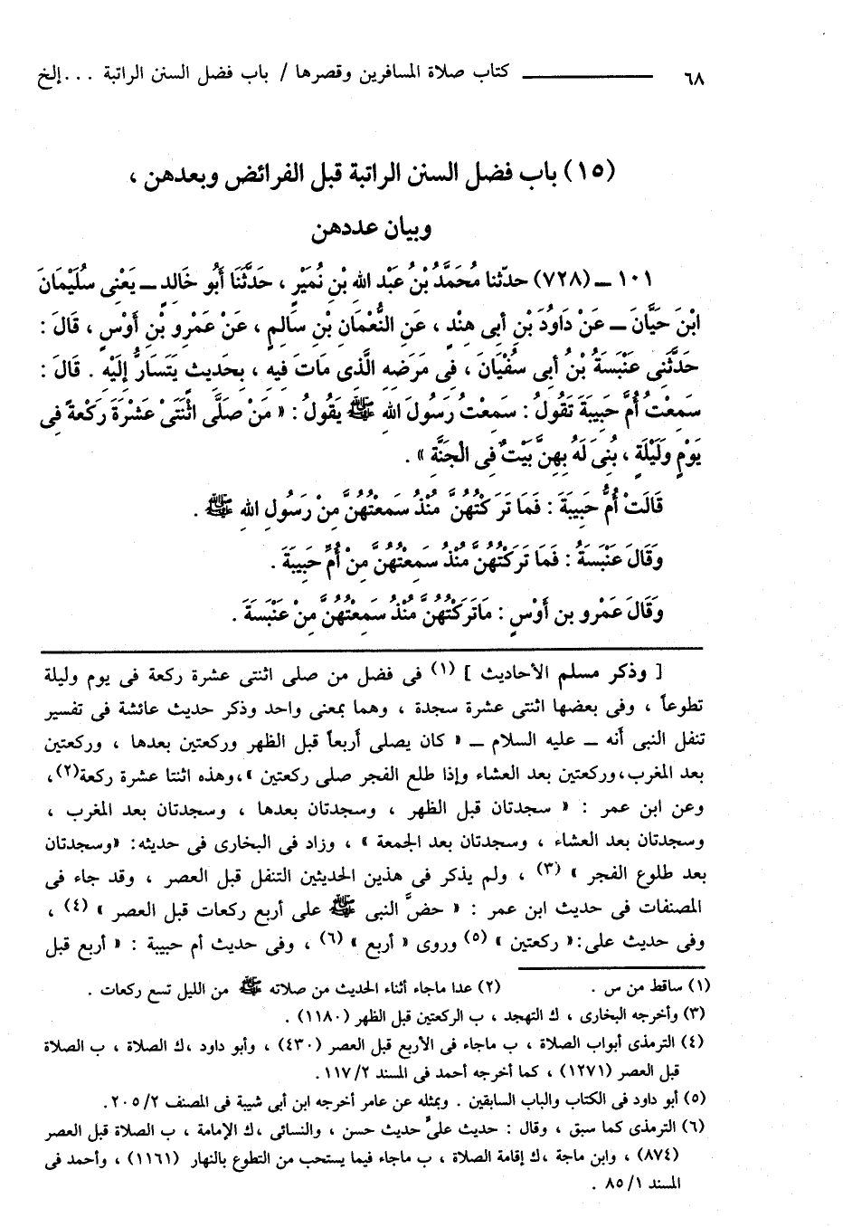 101 - (728) حدّثنا مُحَمَّدُ بْنُ عَبْد اللهِ بْنِ نُمَيْرٍ، حَدَّثَنَا أَبُو خَالِدٍ - يَعْنِى سُلَيْمَانَ ابْنَ حَيَّانَ - عَنْ دَاوُدَ بْنِ أَبِى هِنْدٍ، عَنِ النُّعْمَانِ بْنِ سَالِمٍ، عَنْ عَمْرِو بْنِ أَوْسٍ، قَالَ: حَدَّثَنِى عَنْبَسَةُ بْنُ أَبِى سُفْيَانَ، فِى مَرَضِهِ الَّذِى مَاتَ فِيهِ، بِحَدِيثٍ يَتَسَارُّ إِلَيْهِ. قَالَ: سَمِعْتُ أُمَّ حَبِيبَةَ تَقُولُ: سَمِعْتُ رَسُولَ اللهِ صَلَّى اللهُ عَلَيْهِ وَسَلَّمَ يَقُولُ: " مَنْ صلَّى اثْنَتَىْ عَشْرَةَ رَكْعَةً فِى يَوْمٍ وَلَيْلَةٍ، بُنِىَ لَهُ بِهِنَّ بَيْتٌ فِى الْجَنَّة ".