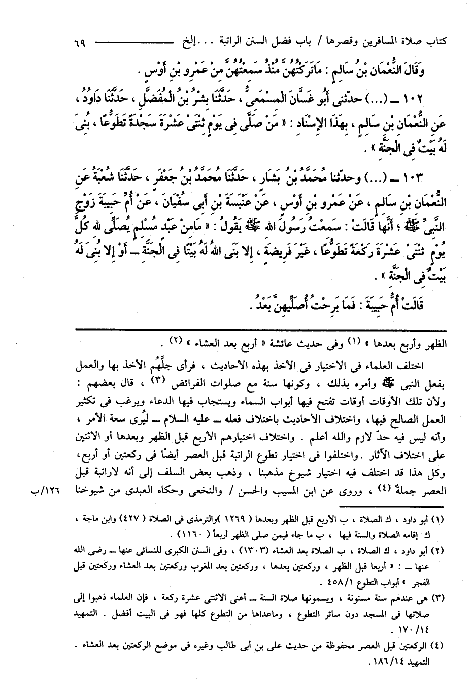 103 - (...) وحدّثنا مُحَمَّدُ بْنُ بَشَّارٍ، حَدَّثَنَا مُحَمَّدُ بْنُ جَعْفَرٍ، حَدَّثَنَا شُعْبَةُ عَنِ النُّعْمَانِ بْنِ سَالِمٍ، عَنْ عَمْرو بْنِ أَوْسٍ، عَنْ عَنْبَسَةَ بْنِ أَبِى سُفْيَانَ، عَنْ أُمِّ حَبِيبَةَ زَوْجِ النَّبِىِّ صَلَّى اللهُ عَلَيْهِ وَسَلَّمَ؛ أَنَّهَا قَالَتْ: سَمِعْتُ رَسُولَ اللهِ صَلَّى اللهُ عَلَيْهِ وَسَلَّمَ يَقُولُ: " مَا مِنْ عَبْدٍ مُسْلِمٍ يُصَلِّى للهِ كُلَّ يَوْمٍ ثِنْتَىْ عَشْرَةَ رَكْعَةً تَطَوُّعًا، غَيْرَ فَرِيضَةٍ، إِلا بَنَى اللهُ لَهُ بَيْتًا فِى الْجَنَّةَ - أَوْ إِلا بُنِىَ لَهُ بَيْتٌ فِى الْجَنَّةِ ".